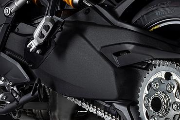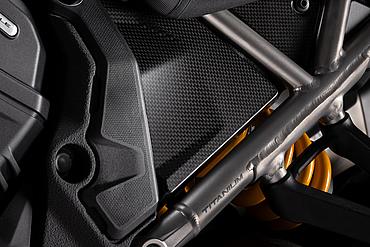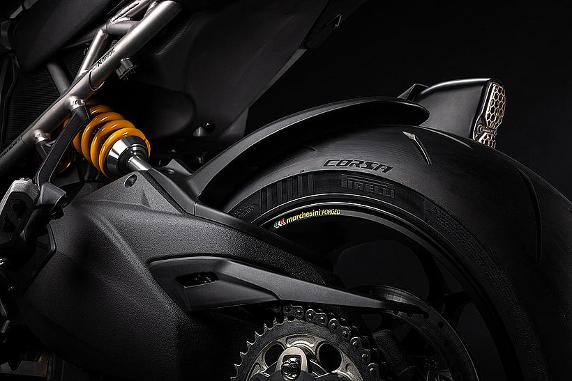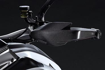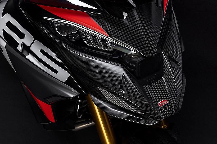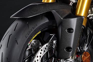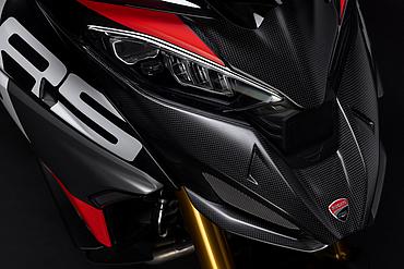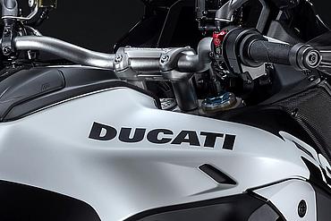 Exklusive Carbon-Komponenten, wie der vordere Kotflügel, die speziell für dieses Modell entwickelten Handprotektoren, der Hitzeschutz und der vordere "Schnabel", sorgen für ein faszinierendes Spiel der Kontraste zur Lackierung in Iceberg White, Ducati Corse Rot, schwarz und grau und tragen auch zur Gewichtsreduktion bei.