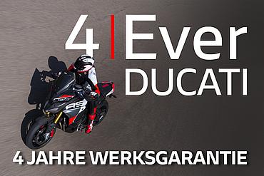 Dank intensiver Praxistests, modernster Simulationstechnologien und kontinuierlich optimierter Produktionsprozesse erreichen Ducati Modelle heute ein neues Höchstmaß an Zuverlässigkeit. Dieses Vertrauen in die eigene Qualität ist die Grundlage für 4Ever Ducati: eine vierjährige Werksgarantie ohne Kilometerbegrenzung, inklusive Mobilitätsservice – exklusiv für alle Multistrada- und DesertX-Modelle.