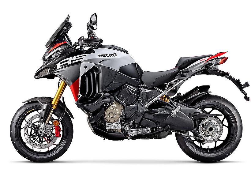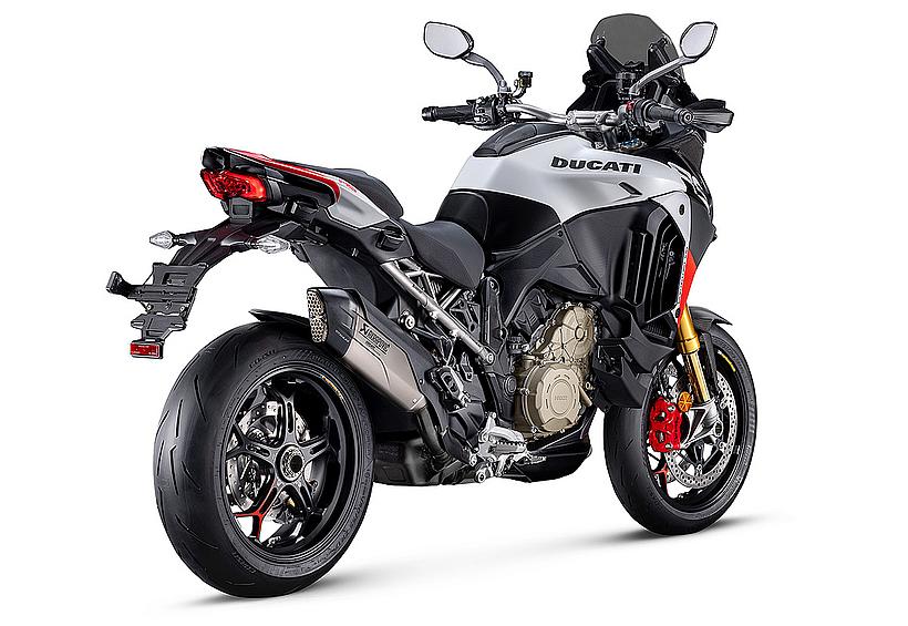 Die Multistrada V4 RS ist das einzige Modell der Multistrada-Familie, das mit dem 1.103 cm³ großen Desmosedici Stradale-Motor mit desmodromischer Ventilsteuerung ausgestattet ist – einem Triebwerk, das aus den Supersportlern Panigale und Streetfighter stammt. Um die für die Multistrada typische Laufruhe und Alltagstauglichkeit mit der explosiven Performance und dem Charakter der Superbike-Modelle zu vereinen, hat Ducati den V4 gezielt neu abgestimmt. So bietet der Motor bei niedrigen Drehzahlen eine sanfte, lineare Leistungsentfaltung und zeigt sich bestens kontrollierbar. Im oberen Drehzahlbereich jedoch verändert sich sein Wesen spürbar: Hier liefert der V4 dank der desmodromischen Ventilsteuerung eine mitreißende Performance und ein Fahrerlebnis, das echte Emotionen weckt. Diese sportliche Persönlichkeit spiegelt sich auch im Sounddesign wider: Der Auspuffton ist im unteren Bereich tief und sonor, bei hohen Drehzahlen hingegen aggressiv und mitreißend – ganz wie bei einem echten Superbike. Ermöglicht wurde diese Charakteristik durch den Einsatz eines durchlässigen, sportlich abgestimmten P08-Luftfilters sowie einer eigens für die Multistrada V4 RS entwickelten Auspuffanlage mit Akrapovič-Schalldämpfer. So entsteht ein einzigartiges Fahrerlebnis, das sportliche Performance und Tourentauglichkeit auf beeindruckende Weise vereint.