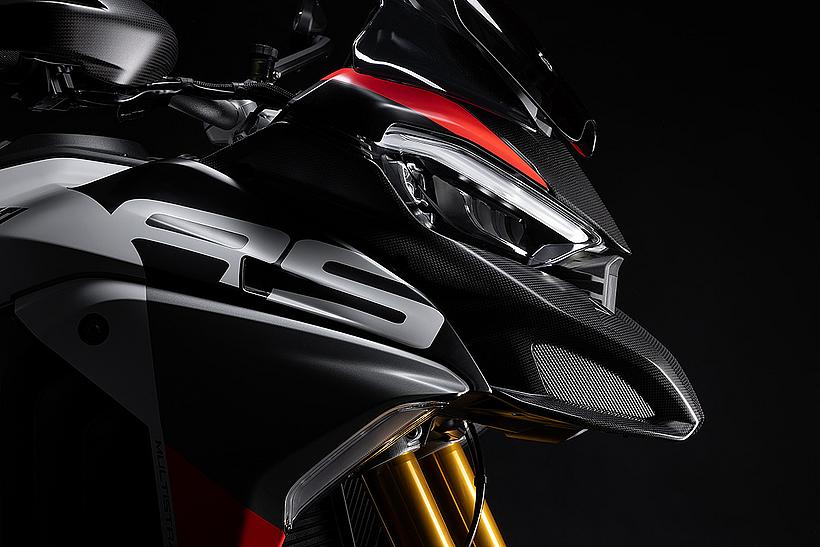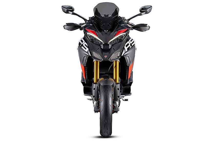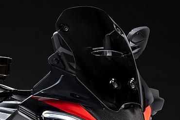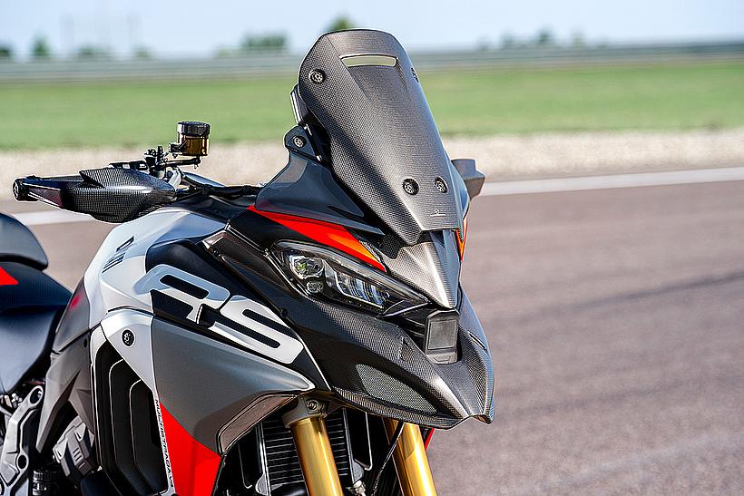 Die sportlichsten Modelle der Multistrada-Reihe waren stets mit kürzeren Windschilden ausgestattet, und auch die Multistrada V4 RS sowie die Pikes Peak folgen dieser Tradition mit einem kurzen, dunkel getöntes Windschild. Es bleibt weiterhin höhenverstellbar, sodass Fahrer auch auf längeren Strecken komfortabel unterwegs sind. Für jene, die zusätzlichen Windschutz wünschen oder ein sportliches Carbon-Windschild bevorzugen, hält das Ducati Zubehörprogramm eine Vielzahl an Optionen bereit.