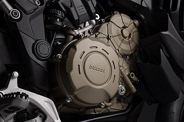 Wie die Panigale V4 Lamborghini ist auch die Multistrada V4 RS mit einer STM EVO-SBK-Trockenkupplung ausgestattet. Diese Kupplung stabilisiert das Fahrverhalten während der Brems- und Einkuppelphasen und verleiht dem Motorrad bei gezogener Kupplung einen charakteristisch metallischen Sound. Ein offener Racing-Kupplungsdeckel aus Carbon – als Originalzubehör erhältlich – erinnert an die glorreichen Zeiten der Ducati 916, die noch immer die Herzen aller Ducati-Enthusiasten höherschlagen lässt. Die Verwendung einer Trockenkupplung ermöglicht zudem den Einsatz eines speziell von Shell in Zusammenarbeit mit Ducati Corse entwickelten Hochleistungsöls. Dieses reduziert die mechanische Reibung um 10 Prozent und steigert die maximale Leistung um 2,5 PS.