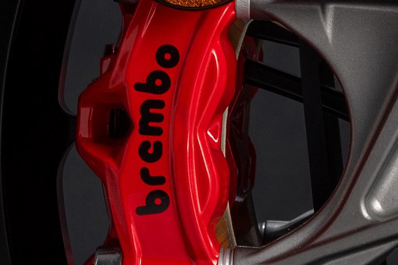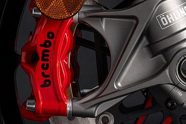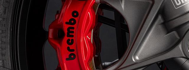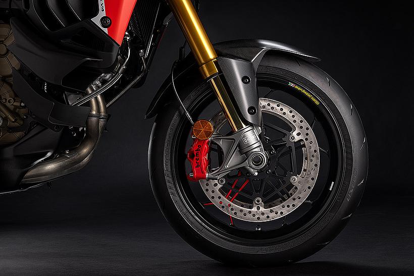 Die Bremsanlage orientiert sich technisch stark an der der Panigale V4 und zählt damit zu den leistungsstärksten Systemen im Segment. Vorne kommen radial montierte Bremspumpen mit verstellbarem Hebel, zwei 330 mm Bremsscheiben und Stylema® M50-Monobloc-Bremssättel von Brembo zum Einsatz. Diese werden aus einem einzigen Aluminiumblock gefräst, sind besonders leicht und kompakt, und bieten durch ihre optimierte Belüftung eine ausgezeichnete thermische Stabilität und Performance. Die vier 30-mm-Kolben der Stylema®-Zangen ermöglichen eine exzellente Dosierbarkeit bei gleichzeitig kurzem Hebelweg – ideal für sportliches Fahren. Auch die Hinterradbremse wurde weiterentwickelt: Eine neue, leistungsfähigere Kombination aus 280 mm Bremsscheibe (6 mm dick) und Brembo-Schwimmsattel sorgt für mehr Bremskraft. Die neue regressive Hebelmechanik verbessert die Feinfühligkeit bei der Dosierung, während der vergrößerte Bremshebel für ein besseres Bremsgefühl sorgt – besonders bei kontrollierten Verzögerungen oder bei Offroad-Einsätzen.