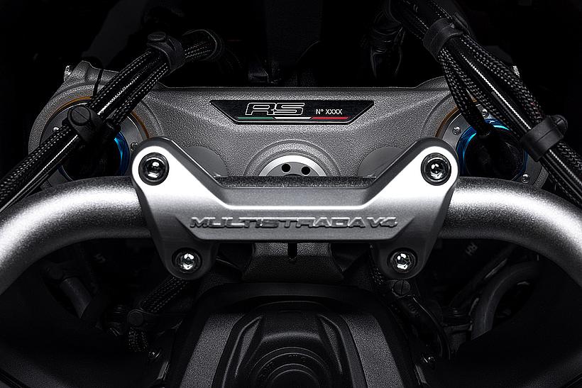 Die Ducati Multistrada V4 RS wird in einer nummerierten Serie gefertigt, deren Nummer sich auf einer mit der italienischen Flagge verzierten, schwarz eloxierten Aluminiumplatte auf der oberen Gabelbrücke wiederfindet und so die Exklusivität des Motorrads unterstreicht.