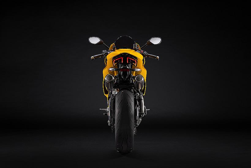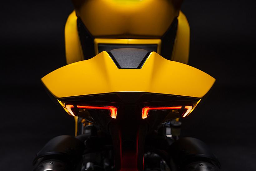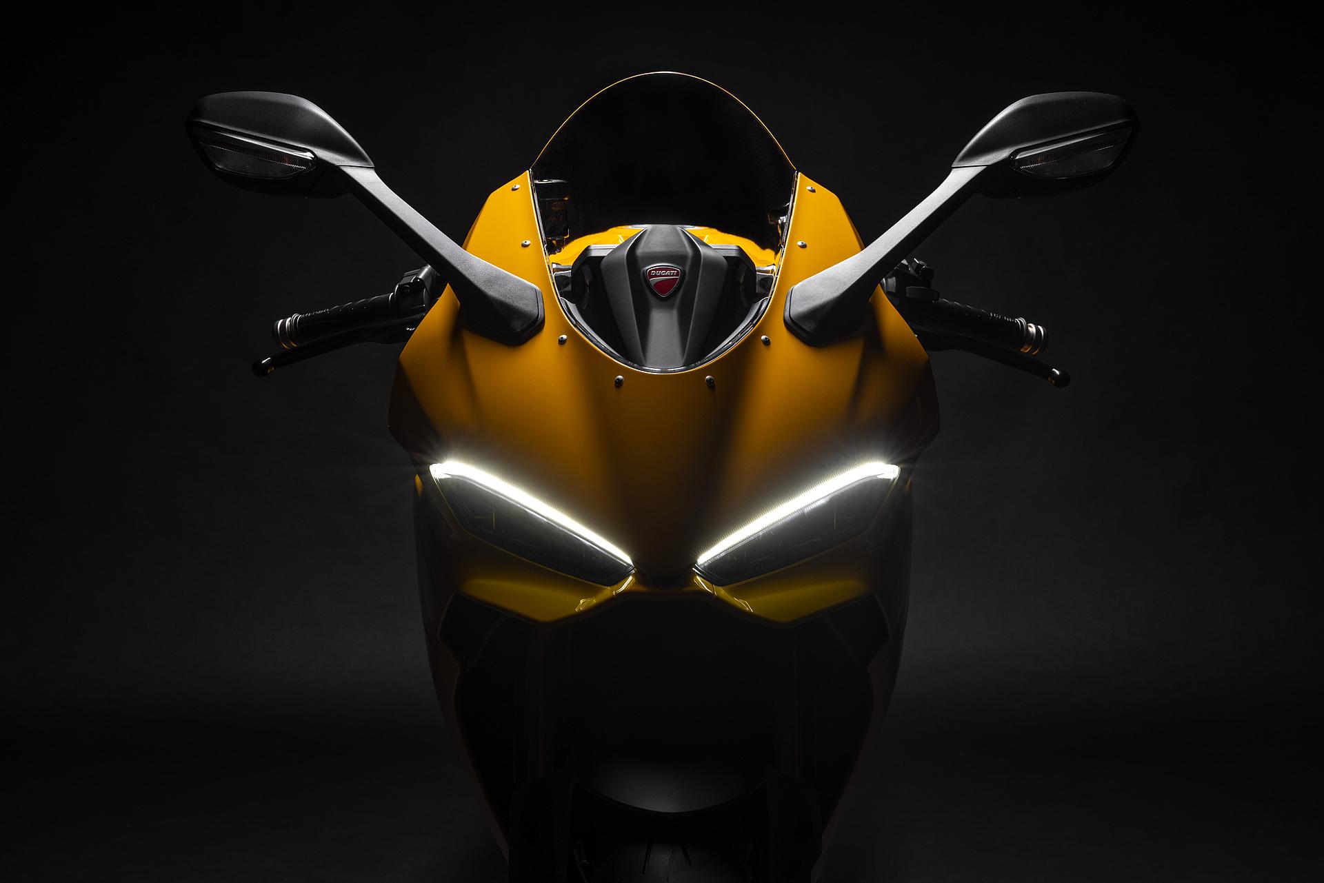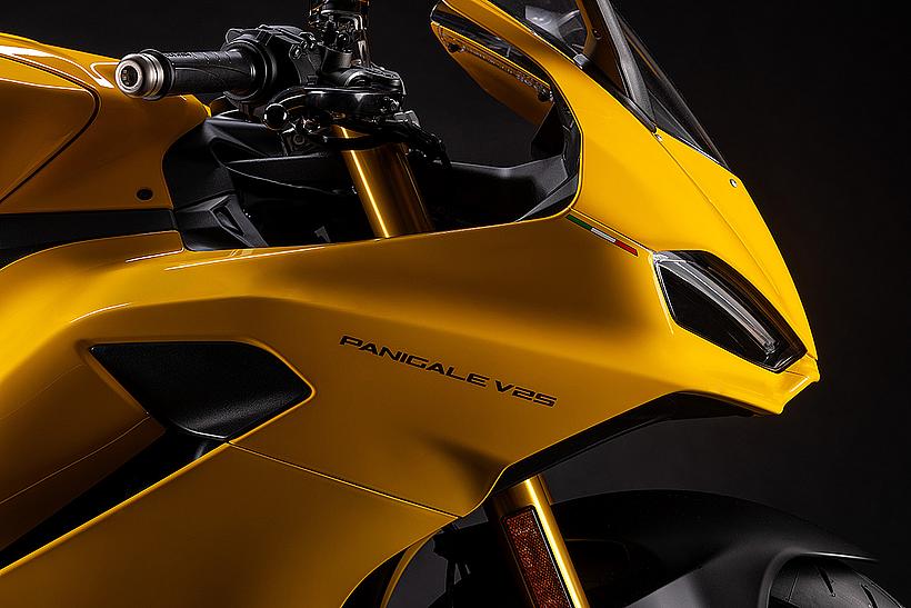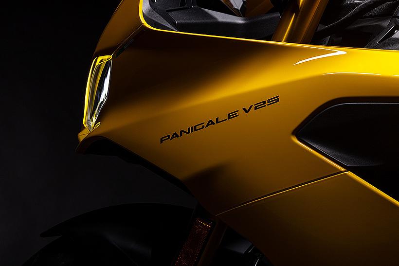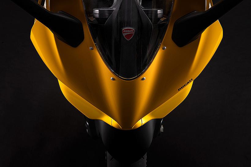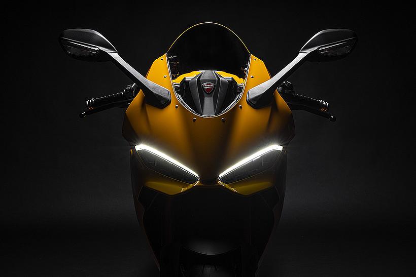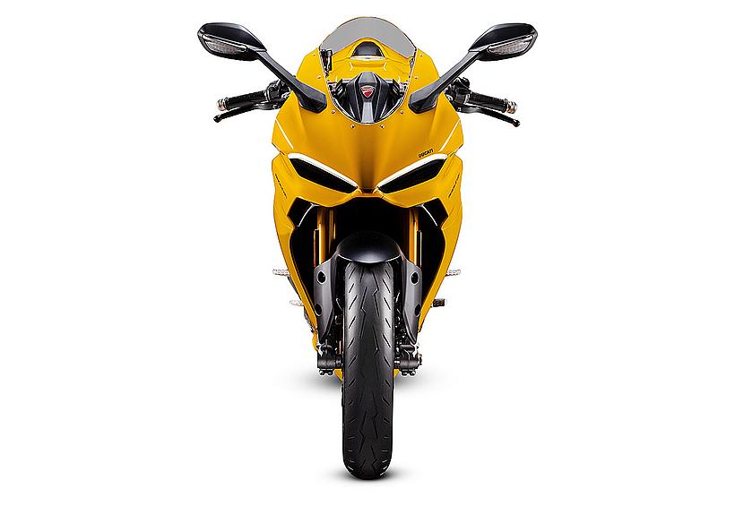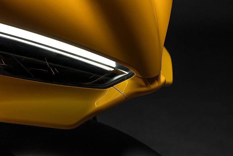 Die Front orientiert sich klar am Design der neuen Panigale V4. Der Voll-LED-Scheinwerfer mit dem auffälligen Tagfahrlicht (DRL) verleiht dem Motorrad denselben dominanten und aggressiven „Look“ und wird von lackierten Flächen im unteren Bereich eingerahmt – einem neuen, markanten Stilmerkmal der Panigale-Familie.
