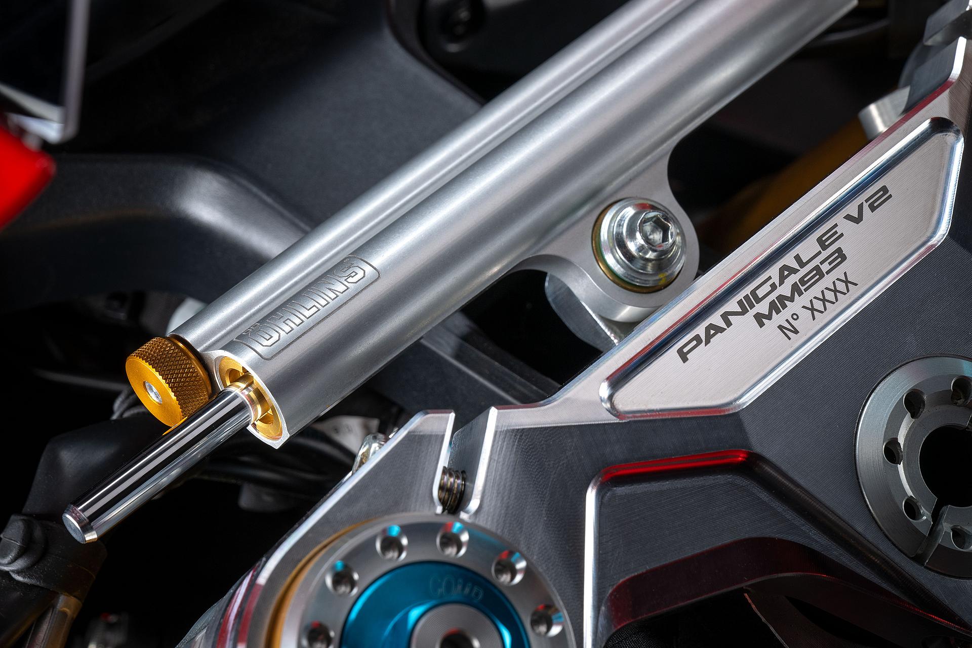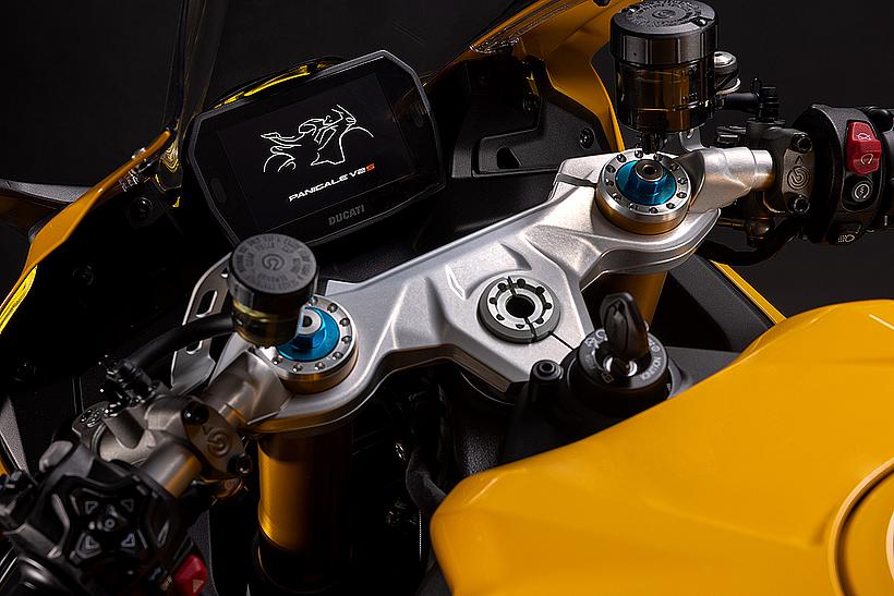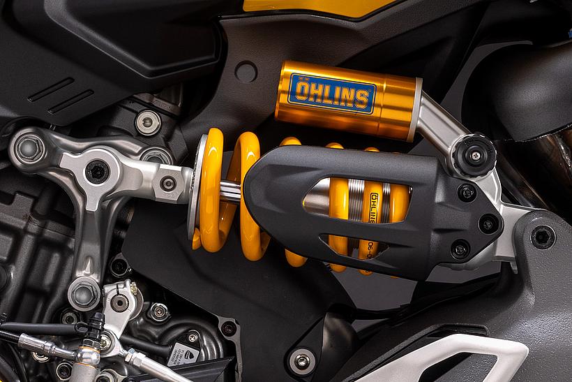 Die Federung vorne wird von einer voll einstellbaren Öhlins-USD-Gabel mit TiN-Beschichteten 43 mm Standrohren bewerkstelligt. Das hinten verbaute Öhlins Federbein mit externen Ausgleichsbehälter ist direkt über eine progressive Umlenkung an der Schwinge montiert und ist in Zug-, Druck- und Federvorspannung einstellbar, letzteres leicht von der Seite zugänglich. Um die Präzision und Stabilität bei hohen Geschwindigkeiten zu verbessern, kommt ein Sachs-Lenkungsdämpfer zum Einsatz. Im Ducati Originalzubehör Programm ist auch ein passender Öhlins Lenkungsdämpfer zu finden.