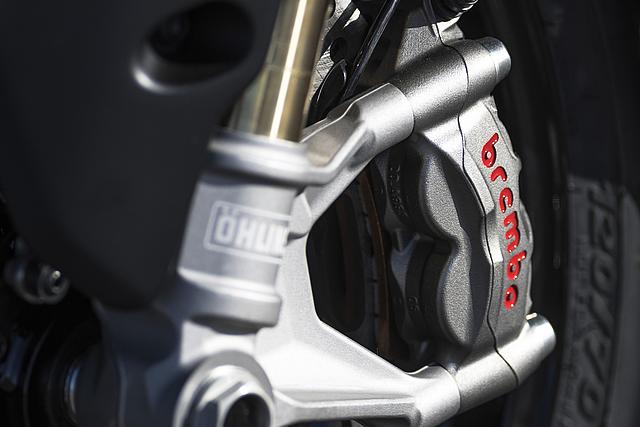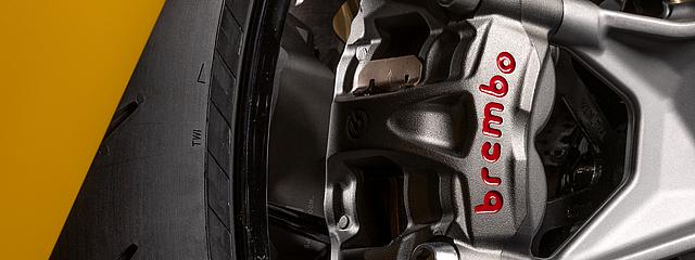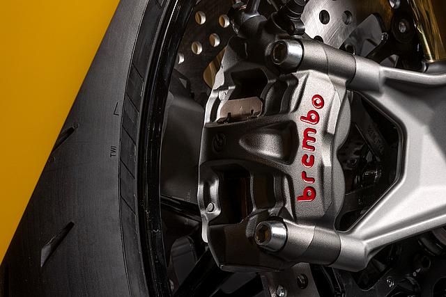 Das Brembo Bremssystem garantiert eine hohe Bremsleistung bei gleichzeitiger höchster Präzision und Sensibilität am Bremshebel sowie eine große Linearität zwischen der aufgebrachten Bremskraft und der Bremsperformance. Vorne verrichten Monoblock-Bremssättel des Typs Brembo M50 mit jeweils vier 30-mm-Kolben auf zwei 320 mm Bremsscheiben wirkend ihren Dienst. Die M50 Bremssättel, die sich auch durch ihre Kompaktheit und ihr niedriges Gewicht (-140 Gramm pro Bremssattel im Vergleich zu den M4.32 Bremszangen) auszeichnen, sind in Monoblock Bauweise, also aus einem Teil gefertigt und dies sorgt für ein Höchstmaß an Steifigkeit und Formstabilität, was wiederum der Bremspräzision und Performance zugute kommt. Das vordere Bremssystem wird von einer Brembo PR16/21 Radialpumpe gesteuert, die ein hohes Gefühl mit einer Bremsleistung verbindet, die in diesem Segment Maßstäbe setzt. Hinten wird mit einer 245 mm Bremsscheibe und einer Brembo 2-Kolben Bremszange verzögert.