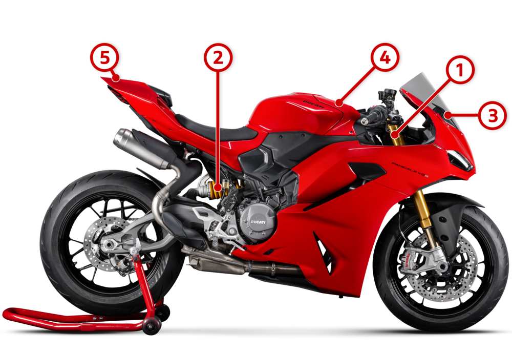 Der Rahmen besteht aus einer nur 4 kg schweren, multifunktionalen Monocoque-Struktur aus Aluminium-Druckguss, die Motor und Lenkkopf, ähnlich wie bei der Panigale, miteinander verbindet. Das hohle Innere dient als Luftfilterkasten mit Luftfilter, Drosselklappen und Einspritzdüsen enthalten, nach oben durch den 15-Liter-Stahltank abgedichtet. In Kombination mit dem speziell entwickelten V2-Motor entsteht eine verwindungssteife Struktur, an die der in Druckgussverfahren gefertigte Aluminium-Heckrahmen angeschraubt ist. Das Ergebnis ist eine geringere Baubreite, eine deutliche Gewichtsreduktion und höchste Fahrpräzision. Scheinwerfer, Windschild und Dashboard werden von einem Techno-Polymer Rahmen getragen.