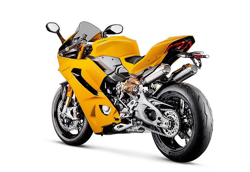 Bei jedem Detail wurde Wert auf hochwertige Komponenten gelegt: geschmiedete Aluminium-Halblenker, einstellbarer Brems- und Kupplungshebel, Radialpumpen bei Bremse und Kupplung mit separaten Flüssigkeitstanks, Fußrasten mit geschmiedeten Anbauteilen und der Fersenschutz aus Aluminium. Um den ästatischen Eindruck einer “Monoposto” – eines Ensitzers zu erhalten müssen nur die am Heckrahmen befestigten Soziusfußrasten demontiert werden.