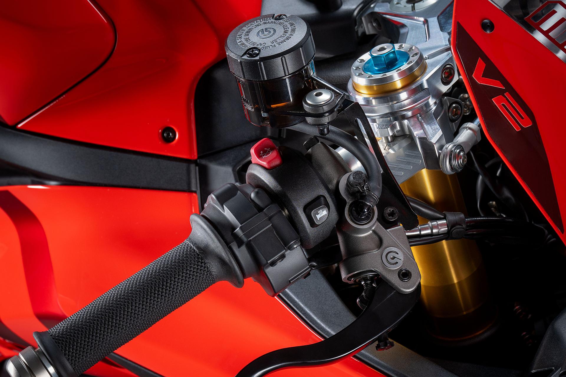 Das ergonomische Dreieck und der Kontaktbereich mit dem Fahrer wurden so konzipiert, dass Halt, Komfort und Alltagstauglichkeit gegeben sind. Die Panigale V2 lässt sich spielerisch und ohne großen Kraftaufwand auf der Landstraße und auch auf der Rennstrecke fahren. Auch Wendemanöver sind dank eines Lenkeinschlags von 30° einfach zu bewerkstelligen. Die Sitzhöhe beträgt 837 mm und dank der schlanken Bauweise ist der Boden leicht erreichbar. Bei der Lenkerhöhe wurde darauf geachtet, dass die Handgelenke nicht zu sehr belastet werden, und die Position der Fußrasten ist so gewählt, dass die Knie nicht zu sehr angewinkelt sind, aber dennoch das Fahren mit höheren Geschwindigkeiten gut möglich ist. Der Soziussitz hat ausreichend Abstand zu den Fußrasten und die Sitzbank ist gut gepolstert.