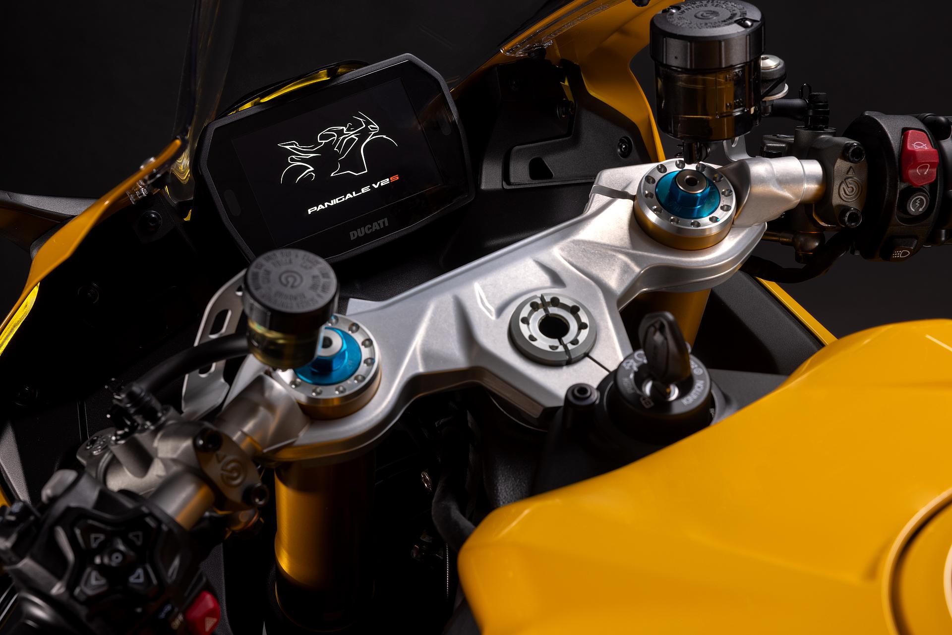 Die Ducati Panigale V2 S hebt sich vom Basismodell durch ihre exklusive Ausstattung deutlich ab. Hochwertige Fahrwerkskomponenten von Öhlins sorgen für präzisere Dämpfung, exzellentes Feedback und herausragende Fahrstabilität. Eine leichte Lithium-Ionen-Batterie und das erweiterte Elektronikpaket mit Ducati Power Launch und Pit Limiter machen die V2 S zur idealen Wahl für ambitionierte Fahrer, die auf der Rennstrecke maximale Performance erzielen möchten. Die S-Version wird in Monoposto-Konfiguration ausgeliefert, der Sozius-Kit ist als Zubehör erhältlich.