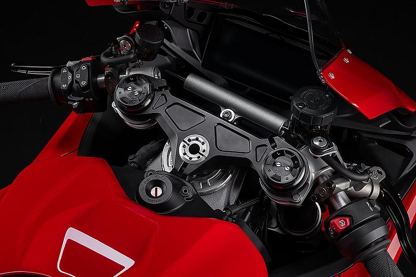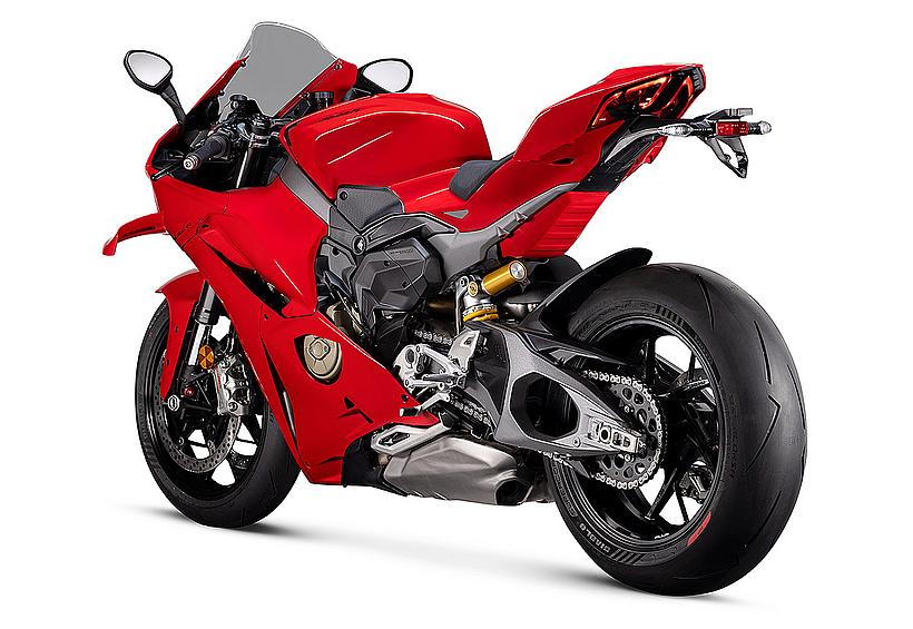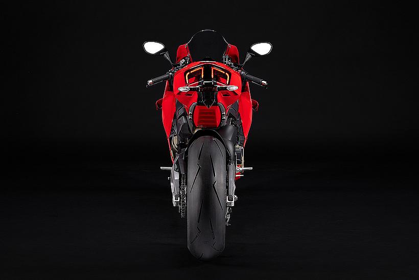 Der Hauptrahmen der Panigale V4 wird durch einen leichten Frontrahmen aus Technopolymer ergänzt, der sowohl das Cockpit als auch den Scheinwerfer trägt. Diese Lösung spart Gewicht und ermöglicht die Aufnahme der Elektronikkomponenten. Der Heckrahmen besteht aus zwei halbschalenförmigen Aluminiumgussteilen, die den unteren Bereich des Tanks unter dem Sitz umschließen. Im Inneren des Heckrahmens verlaufen zwei Luftkanäle, die gezielt heiße Luft aus dem Bereich des Motors nach hinten ableiten. Die Warmluft wird dabei über zwei Auslässe unterhalb des Hecks abgeführt, wodurch die thermische Belastung für Fahrer und auch Elektronik reduziert wird – besonders wichtig im Rennbetrieb oder bei hohen Außentemperaturen.