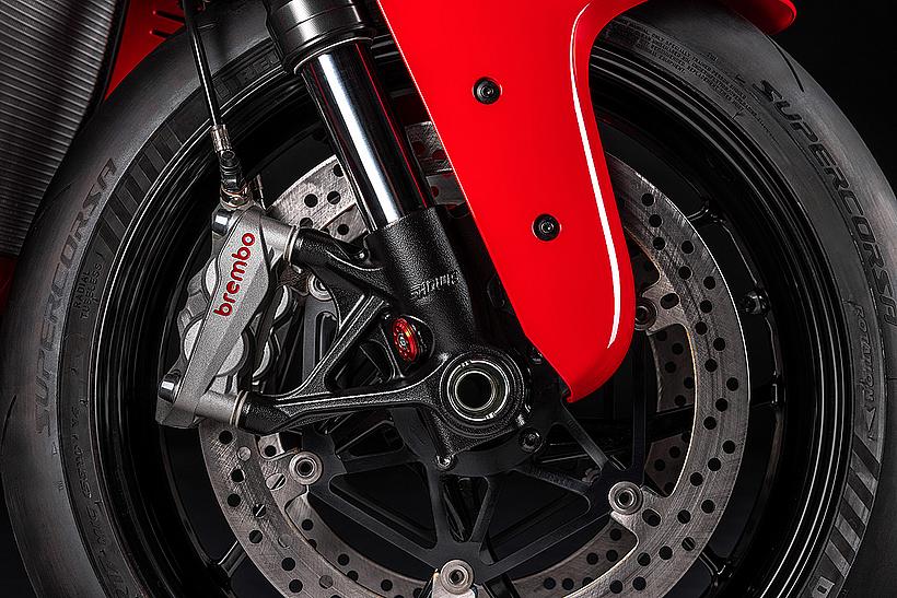 Brembo liefert die schwimmend gelagerten 330-mm-Bremsscheiben sowie die Monobloc-Bremszangen Brembo Hypure®. Diese aus einer Aluminium-Silizium-Legierung in einem Stück gefertigten Bremssättel mit vier 30-mm-Kolben sind pro Stück 60 g leichter als die Stylema-Bremszangen – ohne Abstriche bei der Steifigkeit. Sie leiten die beim Bremsen entstehende Wärme zudem um 4 % effektiver ab und bieten eine konstantere Bremsleistung, was dem Fahrer mehr Sicherheit gibt. Zusätzlich verfügen die Bremszangen über ein Pad-Rückhaltesystem, das den Widerstand beim Freilauf um 15 % reduziert. Die neuen Sättel werden über einen neu entwickelten radialen PR17/19-Hauptbremszylinder angesteuert. Dieser besitzt einen Kolbendurchmesser von 17 mm und einen Hebelweg von 19 mm (im Vergleich zum vorherigen PR16/21), was die Performance der Bremsbetätigung verbessert und den Fahrer bei der Suche nach seinen eigenen Grenzen unterstützt. Hinten kommt eine einzelne 245-mm-Scheibe zum Einsatz, die 0,5 mm dünner und somit 80 g leichter ist, kombiniert mit einem 2-Kolben-Bremssattel. Das gesamte Bremssystem wird durch das Race eCBS-System mit Cornering-Funktion unterstützt, das im Kapitel Elektronik näher beschrieben wird.