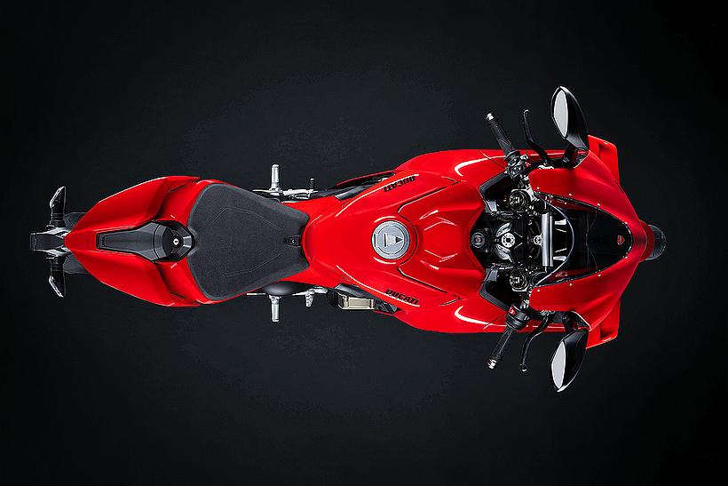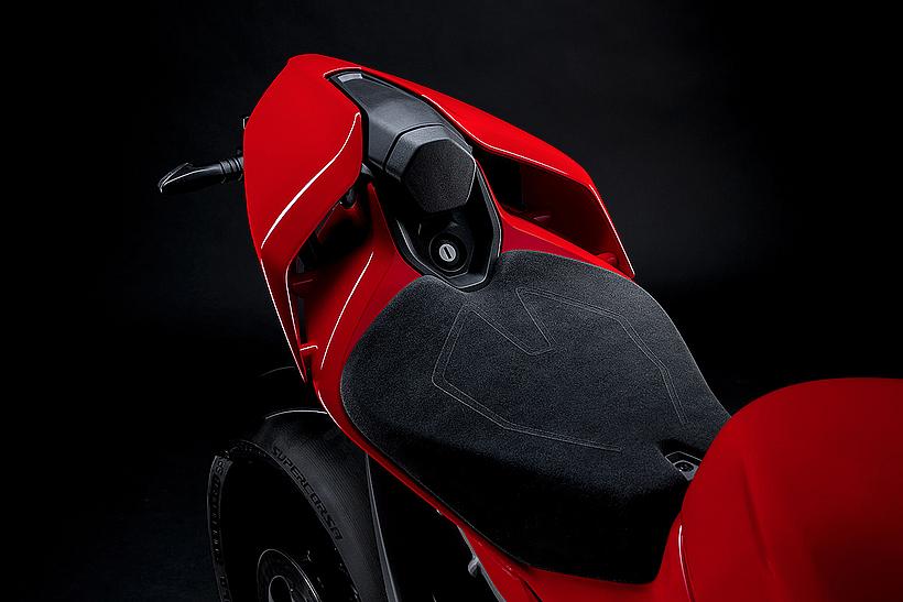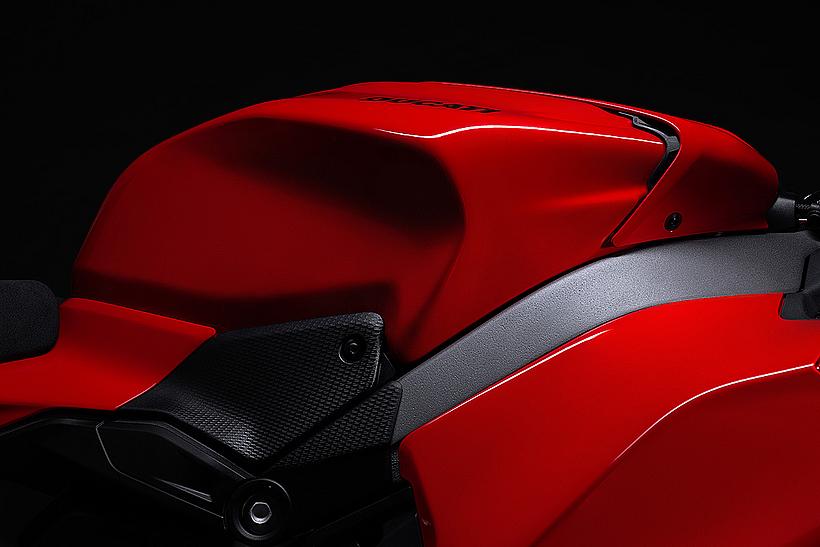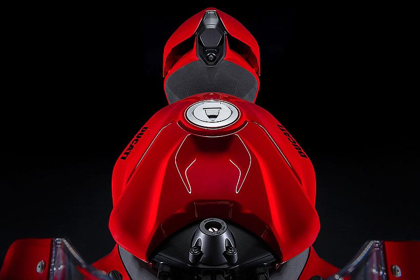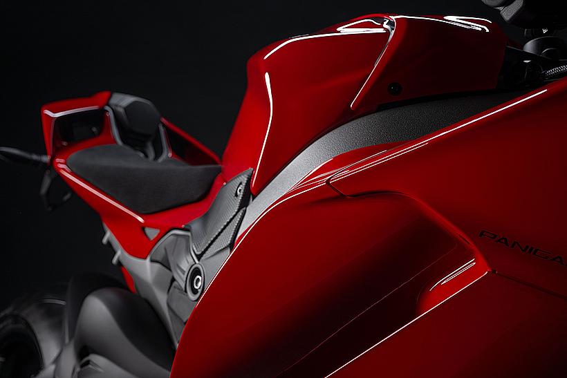 Die Sitzposition der neuen Panigale V4 wurde optimiert, um den Fahrer aerodynamisch besser im Motorrad zu integrieren und die Kontrolle auf der Rennstrecke zu verbessern. Die Sitzbank/Tank-Einheit ermöglicht mehr Bewegungsfreiheit in Längsrichtung und erleichtert die Positionierung durch eine spezielle Aussparung für den Kinnbereich des Helms. Der hintere Tankbereich und die seitlichen Pads unterstützen den Fahrer beim Bremsen, im Kurveneingang und in der Kurve. Gleichzeitig wird vermieden, dass die neue Form des Tanks in anderen Fahrphasen einschränkend wirkt. Dies erleichtert das Abstützen mit den Knien und verringert so auch die Armermüdung. Die Fußrasten wurden um 10 mm nach innen verlegt, was die Bodenfreiheit erhöht, die Aerodynamik verbessert, da der Fahrer seine Füße und Beine weiter innen positionieren kann. Auch die Kraftübertragung wird verbessert und der Fahrer kann mehr Druck auf die Fußrasten ausüben.
