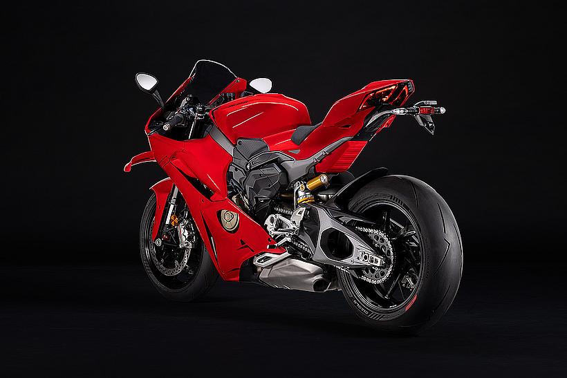 Die enge Zusammenarbeit mit Ducati Corse hat zu einem Motor geführt, der kompakt, leicht und zugleich äußerst leistungsstark ist. In der 90-Grad-V-Bauweise gleichen sich die Massenkräfte erster Ordnung konstruktionsbedingt aus, sodass auf eine Ausgleichswelle zur Reduzierung von Vibrationen verzichtet werden kann. Das spart nicht nur Gewicht, sondern verbessert auch die Drehfreudigkeit und Leistungsentfaltung des Motors. Im Vergleich zu einem klassischen Reihenvierzylinder ermöglicht die kompaktere Bauweise der V-Anordnung eine bessere Massenzentralisierung sowie eine geringere Stirnfläche, was die Aerodynamik verbessert. Zusätzlich reduziert die kürzere Kurbelwelle den gyroskopischen Effekt – ein klarer Vorteil für die Fahrdynamik, insbesondere bei schnellen Richtungswechseln. Das Desmosedici-Stradale-Triebwerk ist um 42 Grad nach hinten geneigt – wie bei den MotoGP-Motoren von Ducati. Diese Neigung verbessert die Gewichtsverteilung, schafft Platz für größere Kühler und erlaubt es, den Schwingendrehpunkt so weit wie möglich nach vorn zu verlagern.