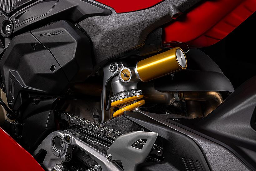 Auch beim Federbein kommt die SV-Technologie zum Einsatz. Das verbaute Öhlins TTX36-SV Federbein kann in Zug- und Druckstufe elektronisch mittels Servomotoren angepasst werden, gesteuert vom neuen Öhlins Smart EC 3.0-System. Die Federvorspannung lässt sich manuell einstellen. Die TTX-Technologie bietet den Vorteil einer komplett getrennten Zug- und Druckstufendämpfung, wodurch das Risiko von Kavitation (Dampfblasenbildung) deutlich reduziert wird.
