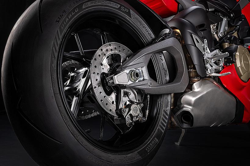Die Panigale V4 Carbon ist mit Fünfspeichen-Felgen aus Carbon ausgestattet, die das Gewicht im Vergleich zu den geschmiedeten Felgen um 0,95 kg reduzieren und das Trägheitsmoment vorne um 12% und hinten um 19% senken. Dank dieser Felgen erhöht sich die Agilität des Motorrads bei Richtungswechseln. Zudem fällt es leichter, die Linie beim Beschleunigen in Schräglage eng zu halten. Ein weiteres Plus dieser neuen Felgen ist die Zulassung auch für den Soziusbetrieb in Verbindung mit dem als Zubehör erhältlichen Biposto Kit. Aber nicht nur die Felgen der Panigale V4 Carbon bestehen aus leichtem und hochfestem Carbon, sondern auch der vordere und hintere Kotflügel und die Winglets sind aus dem „schwarzen Gold“ gefertigt.