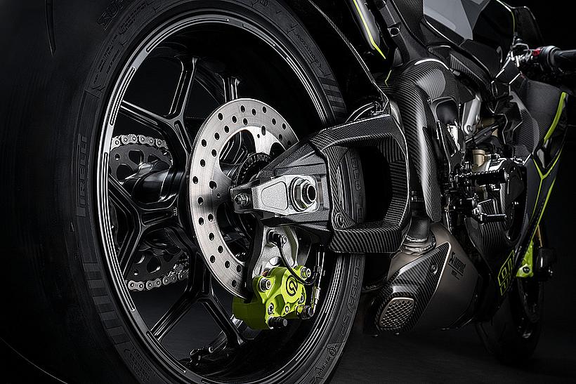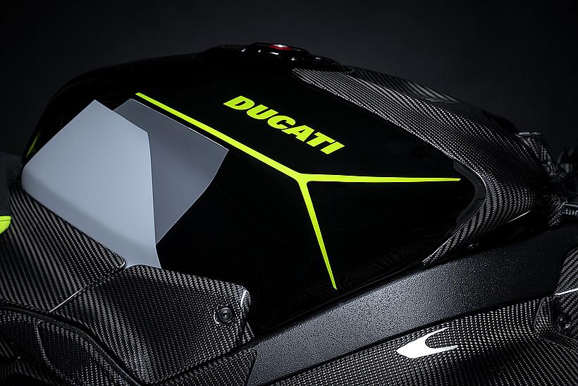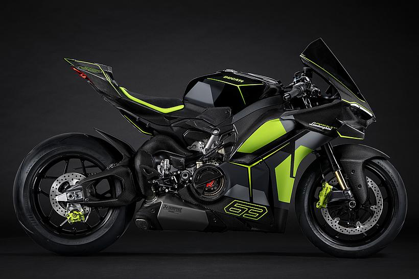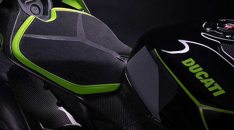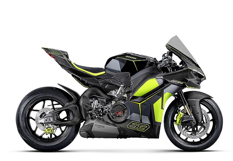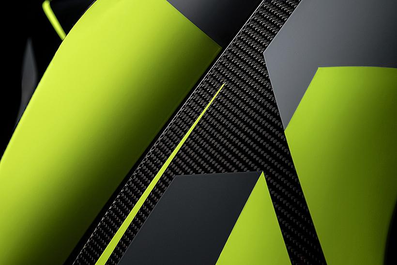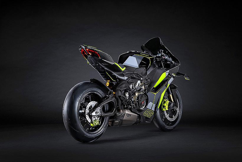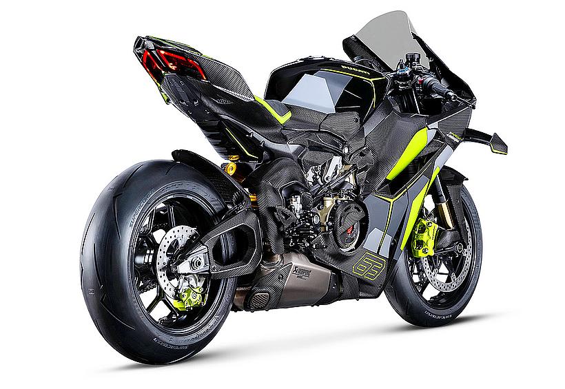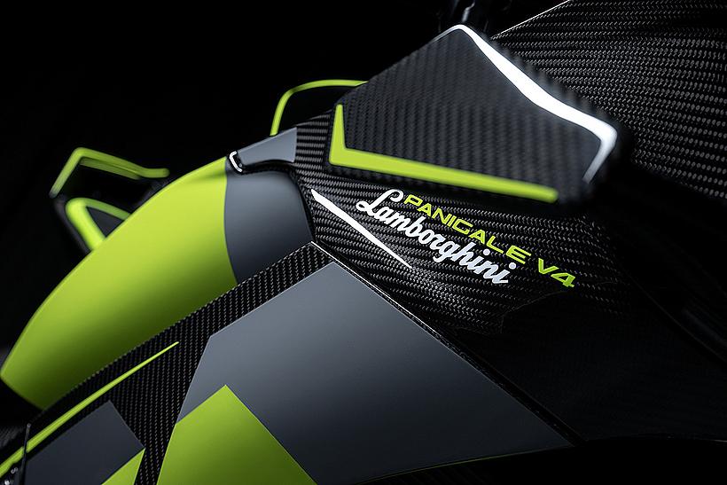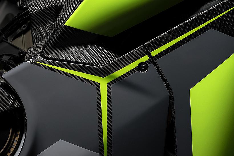 Das Design des Hecks ist von Lamborghini Revuelto inspiriert und greift die markanten Formen der Lüftungsöffnungen der Motorhaube auf. Auch die Winglets, die sich von denen der Panigale V4 S unterscheiden, orientieren sich an typischen Designelementen des Supersportwagens. Auf der Sitzbank findet sich das charakteristische „Y“ in Scandal Green – ein Detail, das sich auch in den Sitzen des Originals wiederfindet, die geschmiedeten Aluminiumräder verfügen über Y-förmige Speichen und die Carbonfasern sind entlang der Fahrzeugmittellinie in einem Twill-Gewebe mit Fischgrätmuster verarbeitet, ganz im Stil des Lamborghini Revuelto.
