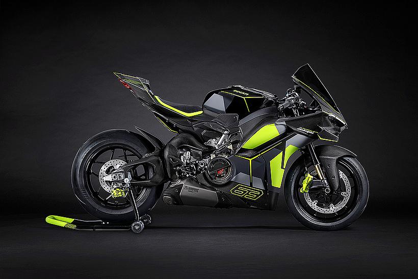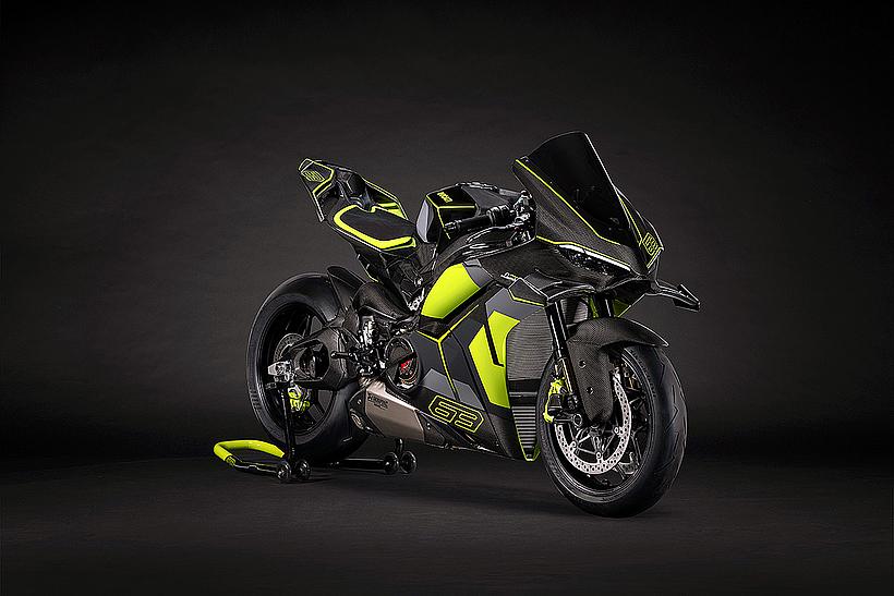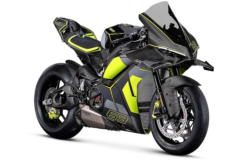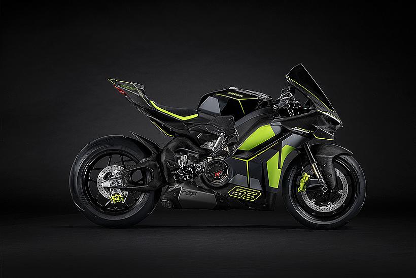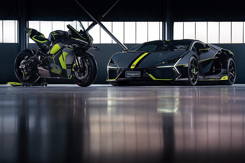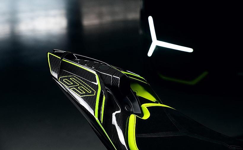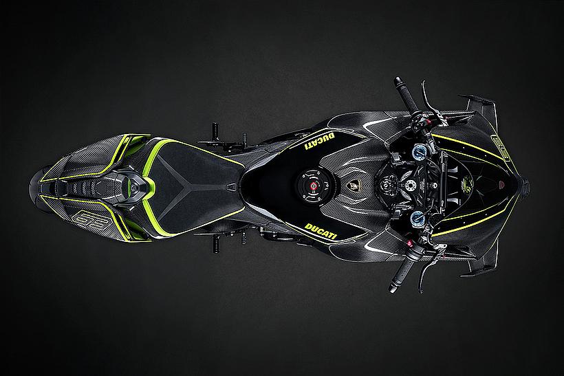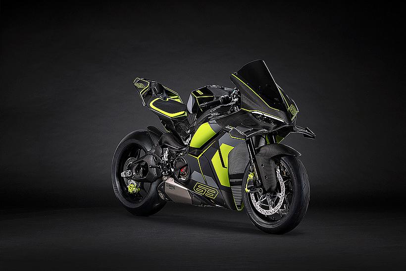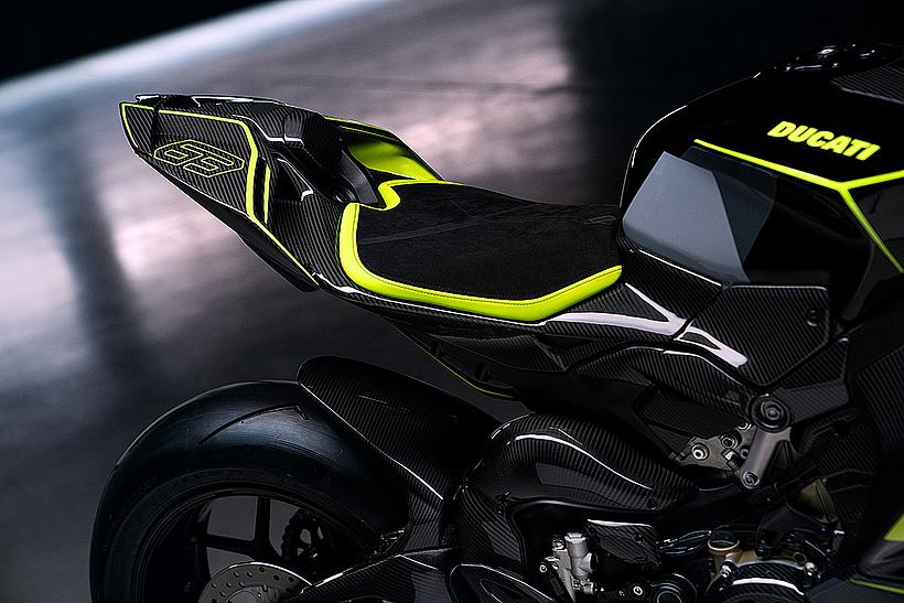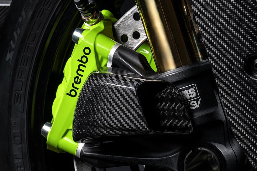 Das Design des Hecks ist von Lamborghini Revuelto inspiriert und greift die markanten Formen der Lüftungsöffnungen der Motorhaube auf. Auch die Winglets, die sich von denen der Panigale V4 S unterscheiden, orientieren sich an typischen Designelementen des Supersportwagens. Auf der Sitzbank findet sich das charakteristische „Y“ in Scandal Green – ein Detail, das sich auch in den Sitzen des Originals wiederfindet, die geschmiedeten Aluminiumräder verfügen über Y-förmige Speichen und die Carbonfasern sind entlang der Fahrzeugmittellinie in einem Twill-Gewebe mit Fischgrätmuster verarbeitet, ganz im Stil des Lamborghini Revuelto.