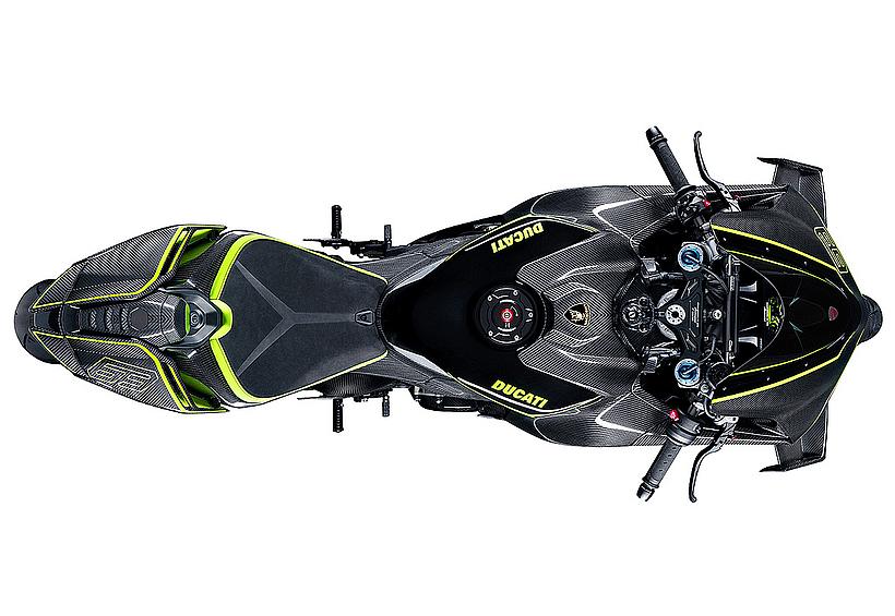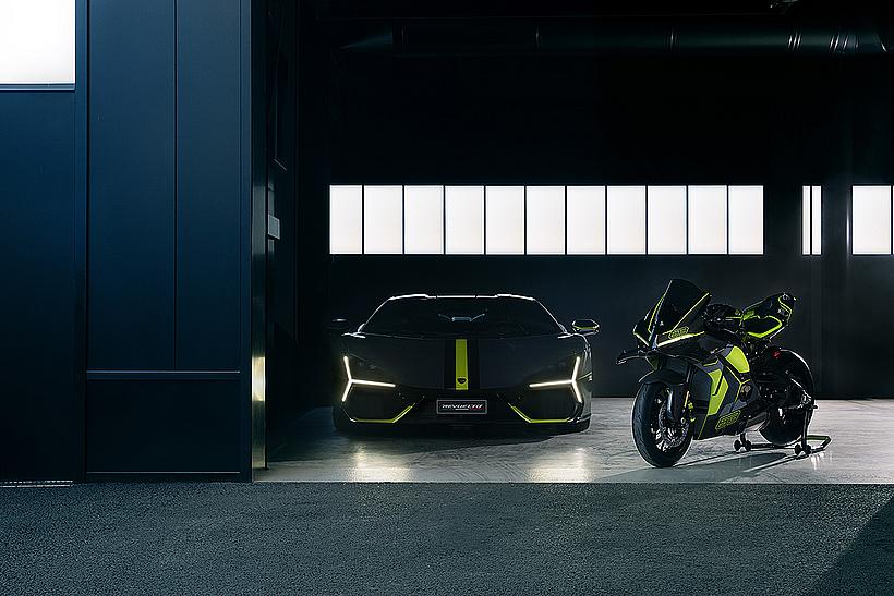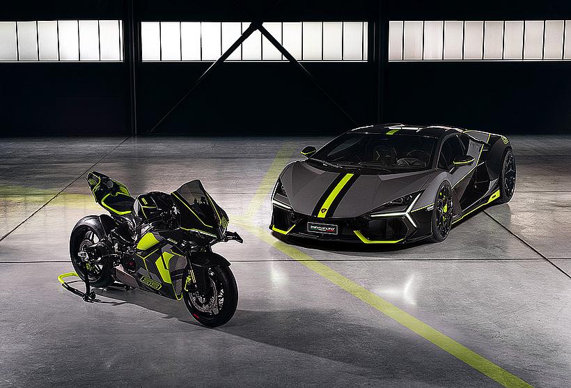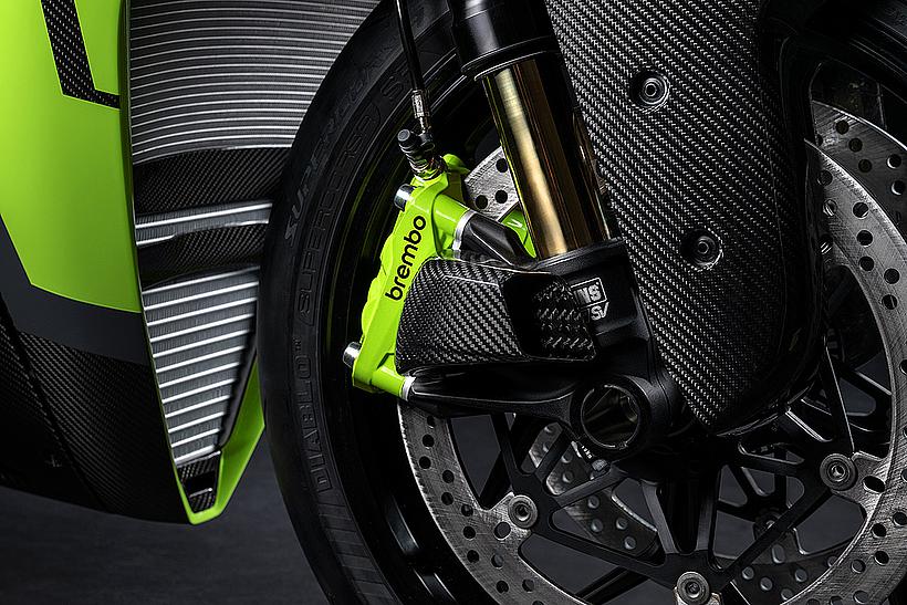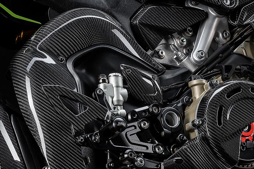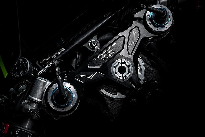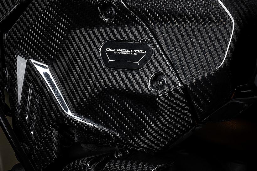 Ein eindrucksvolles Beispiel für die Liebe zum Detail, die die Zusammenarbeit beider Marken prägt, ist die Gestaltung der Carbon-Komponenten: Verkleidung, Hitzeschild, Fersenschutz sowie die vorderen und hinteren Kotflügel weisen dieselbe Carbonstruktur auf, wie sie auch in den Supersportwagen von Lamborghini verwendet wird. Entlang der Symmetrielinie des Motorrads, an der sich das Gewebe trifft, entsteht das charakteristische Fischgrätenmuster – ein Ausdruck handwerklicher Präzision auf höchstem Niveau.