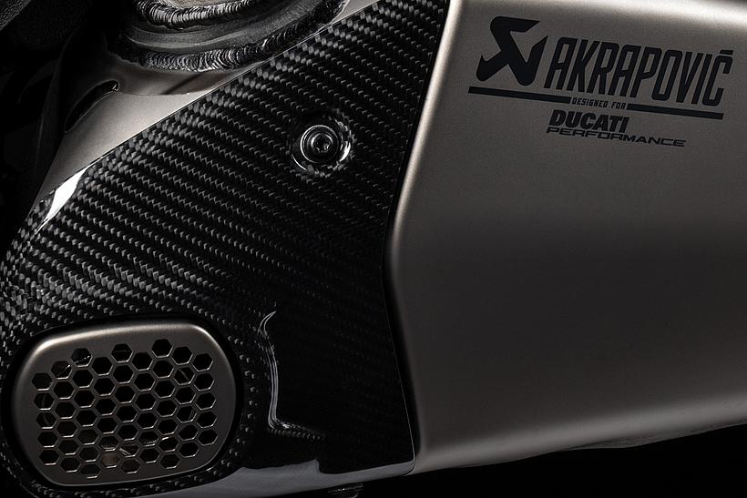 Das Motorrad ist mit einem straßenzugelassenen Akrapovič-Titanschalldämpfer mit Endkappen aus Carbon ausgestattet. In Kombination mit einer speziellen Motorabstimmung steigt die maximale Leistung der Panigale V4 Lamborghini auf 218,5 PS bei 13.500 U/min. Durch den hohen Anteil an Carbon-Komponenten und den leichten Schalldämpfer reduziert sich das Gesamtgewicht auf 185 kg – fast 2 kg weniger als bei der Panigale V4 S. Das Leistungsgewicht verbessert sich dadurch von 1,15 auf 1,18 PS/kg. Damit ist die Panigale V4 Lamborghini das leistungsstärkste und leichteste Modell innerhalb der Ducati-Superbike-Reihe.