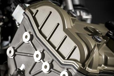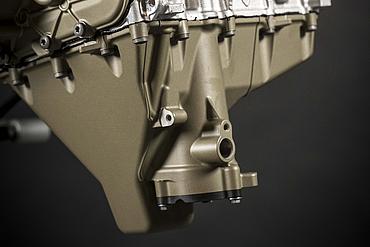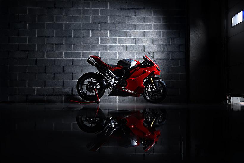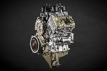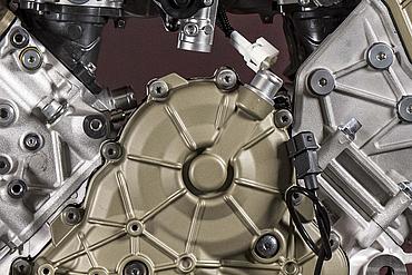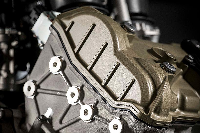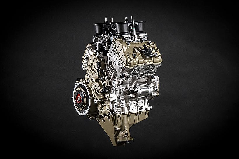 Die enge Zusammenarbeit mit Ducati Corse hat zu einem Motor geführt, der kompakt, leicht und zugleich äußerst leistungsstark ist. In der 90-Grad-V-Bauweise gleichen sich die Massenkräfte erster Ordnung konstruktionsbedingt aus, sodass auf eine Ausgleichswelle zur Reduzierung von Vibrationen verzichtet werden kann. Das spart nicht nur Gewicht, sondern verbessert auch die Drehfreudigkeit und Leistungsentfaltung des Motors. Im Vergleich zu einem klassischen Reihenvierzylinder ermöglicht die kompaktere Bauweise der V-Anordnung eine bessere Massenzentralisierung sowie eine geringere Stirnfläche, was die Aerodynamik verbessert. Zusätzlich reduziert die kürzere Kurbelwelle den gyroskopischen Effekt – ein klarer Vorteil für die Fahrdynamik, insbesondere bei schnellen Richtungswechseln. Das Desmosedici-Stradale-Triebwerk ist um 42 Grad nach hinten geneigt – wie bei den MotoGP-Motoren von Ducati. Diese Neigung verbessert die Gewichtsverteilung, schafft Platz für größere Kühler und erlaubt es, den Schwingendrehpunkt so weit wie möglich nach vorn zu verlagern.
