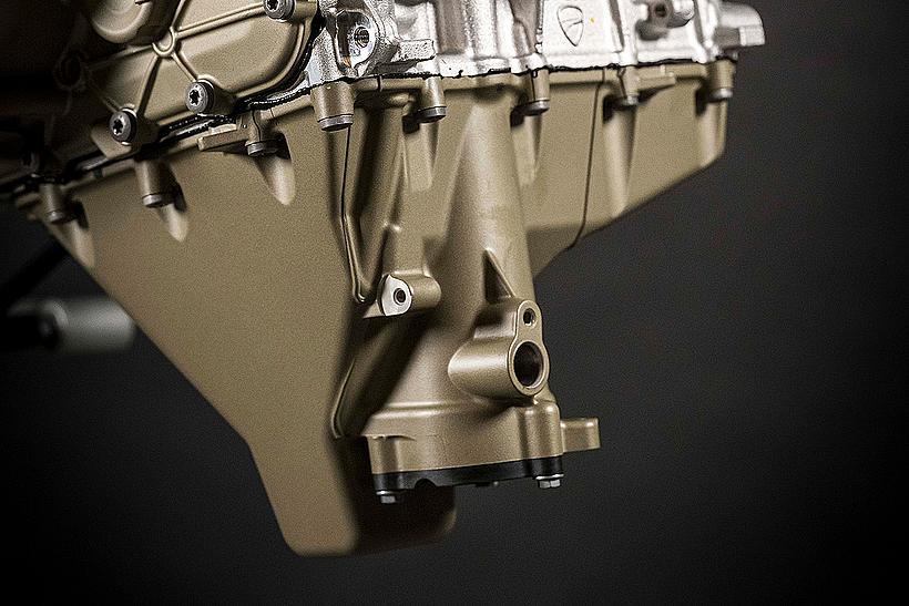 Um diese Leistung unter Einhaltung der strengen Euro5+-Vorschriften zu erreichen, haben die Ingenieure von Ducati die Ansaugseite und Nockenwellen überarbeitet und so die Verbrennung optimiert. Die Drosselklappen und damit auch der Luftfilterkasten wurden neu gestaltet, um Platz für das neue Einspritzventilgehäuse zu schaffen. Die ovalen Drosselklappen, deren Durchmesser weiterhin 56 mm beträgt, wurden in ihrer Öffnungsrichtung umgekehrt, um die Einspritzdüse 10 mm höher optimal positionieren zu können. Um die daraus resultierende Verlängerung des Ansaugkanals auszugleichen, wurde die Länge der Ansaugtrichter entsprechend reduziert. Auch die unteren Einspritzdüsen, die bei bestimmten Steuerzeiten arbeiten, wurden anstatt unterhalb des Ansaugkanals oberhalb positioniert. In dieser Position kann der Sprühkegel den Kraftstoff effektiver zerstäuben. Dadurch entsteht ein homogeneres Luft-Kraftstoff-Gemisch in der Brennkammer, was die Verbrennungseffizienz bei niedrigen Drehzahlen verbessert und die Emissionen reduziert, insbesondere bei Kälte und in der Startphase. Auch der Durchfluss im höheren Leistungsbereich wurde dadurch verbessert (+1,5 %). Der hochdurchlässige Polyester-Luftfilter reduziert den Druckverlust im Vergleich zu einem herkömmlichen Filter und trägt so zur maximalen Leistungsentfaltung bei.