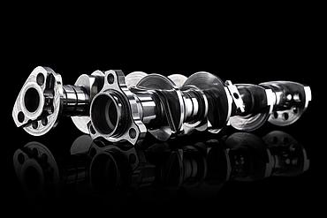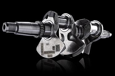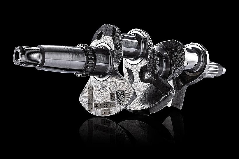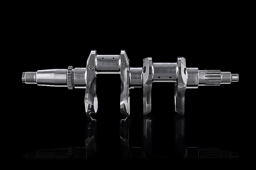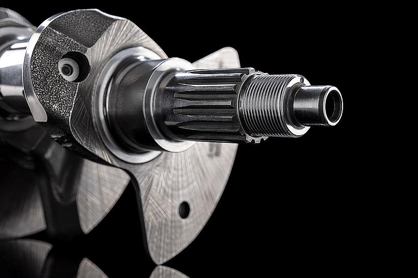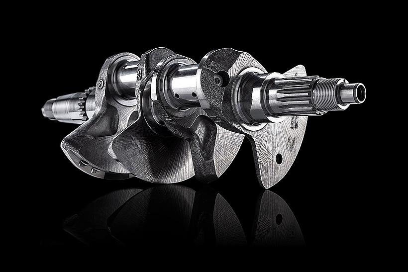 Um den Anforderungen von Ducati Corse gerecht zu werden, wurde der Desmosedici Stradale R-Motor grundlegend weiterentwickelt – insbesondere im Bereich von Kolben und Kurbelwelle. Die Trägheit der Kurbelwelle wurde um 8 % erhöht, bei nur 195 Gramm zusätzlichem Gewicht – mit dem Ziel, ein gleichmäßigeres Ansprechverhalten zu ermöglichen, das die Traktion verbessert, das Bremsverhalten stabilisiert und die Eingriffe der elektronischen Assistenzsysteme spürbar reduziert. Die Kombination aus höherer Kurbelwellenmasse und gegenläufiger Rotation sorgt für ein deutliches Plus an Fahrbarkeit, ohne die Reaktionsfreude des Motors nennenswert zu beeinträchtigen. Warum verbessert eine schwerere Kurbelwelle die Agilität? Dafür macht man sich eine Technik aus der MotoGP zunutze: die gegenläufig rotierende Kurbelwelle. Im Gegensatz zu herkömmlichen Straßenmotorrädern, bei denen sich Kurbelwelle und Räder in die gleiche Richtung drehen, reduziert diese Bauweise den gyroskopischen Effekt und die Massenträgheitskräfte – dadurch wird das Motorrad agiler, und Richtungswechsel lassen sich deutlich leichter vollziehen. Gleichzeitig wirkt die gegenläufige Rotation dem Aufstellen des Vorderrads beim Beschleunigen sowie dem Abheben des Hinterrads beim Bremsen entgegen, was die Fahrzeugkontrolle verbessert. Um das Getriebe und das Hinterrad dennoch korrekt vorwärts anzutreiben, ist eine sogenannte Umkehrwelle notwendig. Diese wirkt sich jedoch auf Leistungsmessungen aus, weshalb auf Rollenprüfständen ein Korrekturfaktor von 0,98 zu berücksichtigen ist.