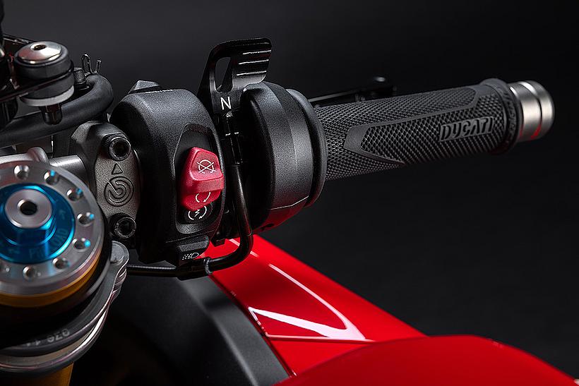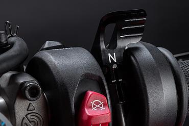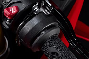 Die neue Panigale V4 R ist das erste Serienmotorrad weltweit mit rennsporttypischer Schaltlogik. Bei der Ducati Racing Gearbox (DRG) liegt der Leerlauf – wie bei den Rennmotorrädern – unterhalb des ersten Gangs statt zwischen dem ersten und zweiten. So wird in der letzten, sensibelsten Phase des Anbremsens beim Einlenken in eine Kurve auch das Schalten in den ersten Gang ermöglicht und eine optimale Motorbremswirkung gewährleistet. Gleichzeitig ermöglicht das Fehlen des Leerlaufs zwischen dem ersten und zweiten Gang schnellere, flüssigere und reproduzierbare Schaltvorgänge im Vergleich zu einem Getriebe mit herkömmlicher Schaltlogik. Um ein unbeabsichtigtes Herunterschalten vom ersten Gang in den Leerlauf zu verhindern, verfügt das Getriebe über das patentierte Ducati Neutral Lock (DNL). Zum Einlegen des Leerlaufs sind mit diesem System die gleichen Handgriffe erforderlich wie bei den offiziellen Ducati-Werksfahrern in der MotoGP und der Superbike-WM: Der Leerlauf wird durch Betätigen des Entriegelungshebels am rechten Lenker freigegeben. Diese technische Lösung macht ein versehentliches Einlegen des Leerlaufs, insbesondere beim Herunterschalten, unmöglich. Darüber hinaus erfordert das Schalten vom ersten in den zweiten Gang weniger Pedalweg und erfolgt schneller und organischer. Der Sperrmechanismus wird nach Betätigung automatisch durch Federn reaktiviert.