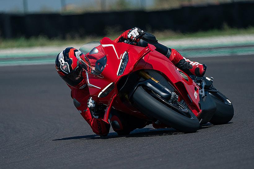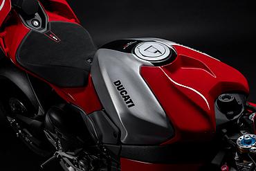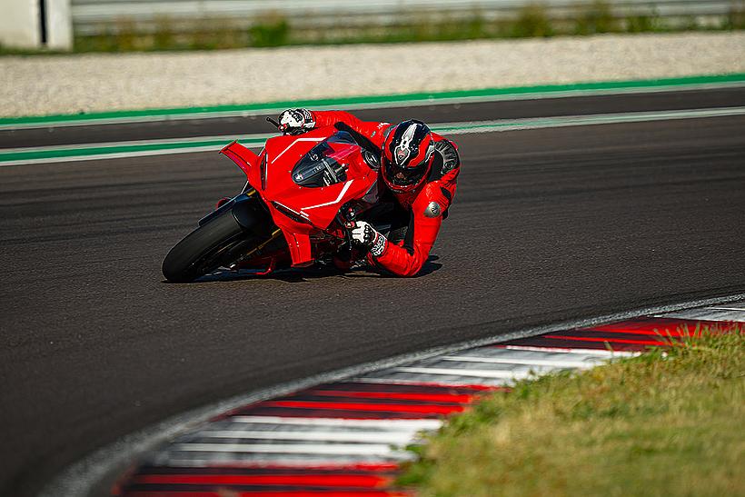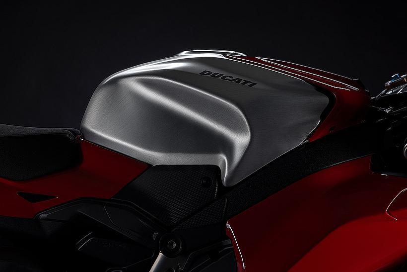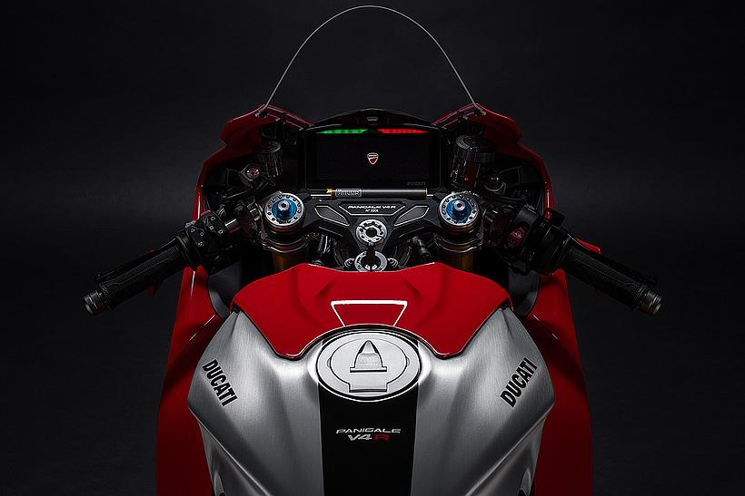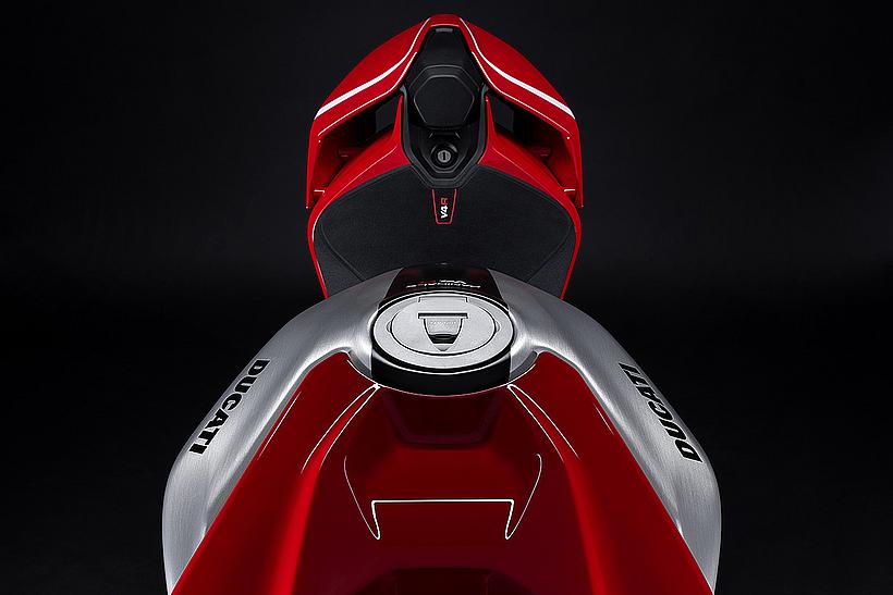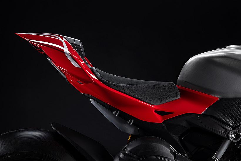 Die Ergonomie der Panigale V4 R folgt den Weiterentwicklungen der neuen Panigale V4 7G mit dem Ziel, die Kontrolle über das Motorrad in den anspruchsvollsten Rennsituationen zu verbessern. Das steigert die Performance sowohl bei einer schnellen Runde als auch über die gesamte Renndistanz. Die wichtigsten Neuerungen betreffen Sitz (50 mm breiter), Tank (neue Form), die Kontaktflächen zwischen Fahrer und Motorrad sowie die Position der Fußrasten. Das neue Tankdesign mit einer optimierten Heckpartie erleichtert die Bremsphasen und das „Hanging Off“ in Kurven, da es eine bessere Knieauflage für Fahrer jeder Körpergröße ermöglicht. So wird der Kraftaufwand reduziert, die Position in Schräglage stabilisiert und die Effizienz beim Bremsen gesteigert. Dank dieser Änderungen ist der Fahrer auch besser geschützt, wenn er sich auf der Geraden hinter die Verkleidung duckt. Große Aufmerksamkeit wurde auch der Positionierung der Fußrasten gewidmet, die nun 10 mm weiter innen liegen – ohne die Auflagefläche für den Fahrer zu reduzieren. Die neue Position ermöglicht dem Fahrer eine aerodynamischere Fahrhaltung, erhöht die Bodenfreiheit und sorgt für eine entspanntere Fahrt, da weniger auf die Fußposition geachtet werden muss, um unerwünschten Kontakt mit dem Asphalt zu vermeiden.