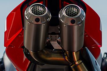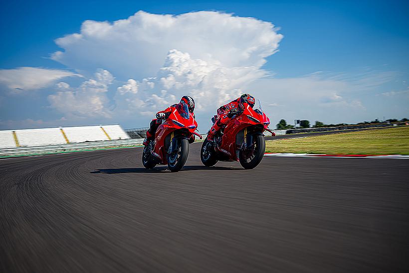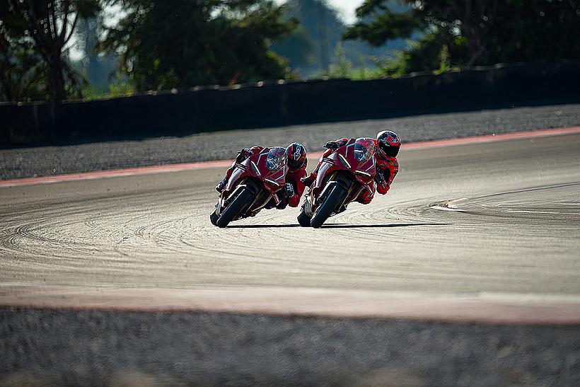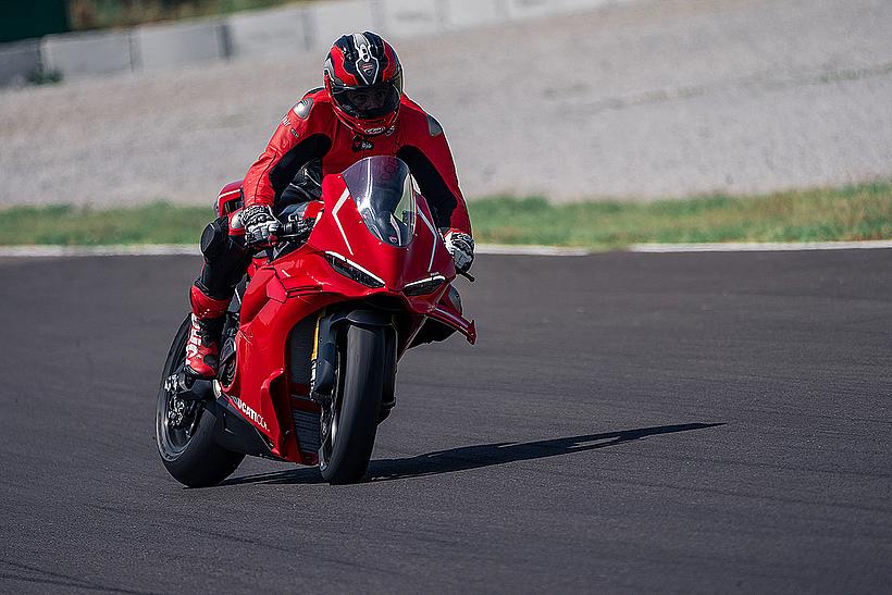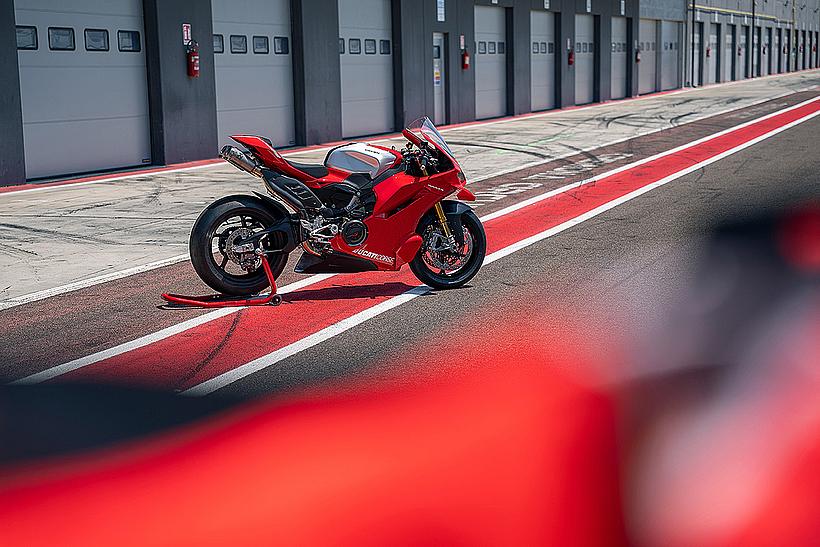 Das Herzstück der Panigale V4 R ist der kompakte 998 cm³ Desmosedici Stradale R-Motor, der kompromisslos für den Einsatz in der Superbike-Weltmeisterschaft entwickelt wurde – ein echtes Racing-Triebwerk mit desmodromischer Ventilsteuerung, gegenläufiger Kurbelwelle und Twin-Pulse-Zündfolge. Das Layout des 90°-V4 ist um 42° nach hinten geneigt, entspricht dem der MotoGP-Bikes, macht den Motor kompakt, ermöglicht die Zentrierung der Massen und eine hervorragende Integration ins Motorrad. Er verfügt über zahlreiche technische Lösungen aus dem Rennsport – darunter gebohrte Titanpleuel, DLC-beschichtete Kolbenhemden, eine kompakte SBK-Trockenkupplung sowie die gleichen Übersetzungsverhältnisse wie bei beim Panigale V4 Superbike für den ersten, zweiten und sechsten Gang. Die Höchstdrehzahl beträgt 16.500 U/min im sechsten Gang. Die maximale Leistung liegt bei 218 PS in Euro-5+-Konfiguration und steigt in der Racing-Konfiguration mit Akrapovic-Auspuffanlage und Shell Performance Öl auf 239 PS – echtes Racing-Niveau. Das Drehmoment konnte im Vergleich zur Vorgängerversion bei 6.000 U/min um 7% gesteigert werden. Diese Werte sind das Ergebnis der großartigen Arbeit der Ducati-Ingenieure, die die neue Panigale V4 R Euro-5+-konform gemacht haben, ohne das Ziel maximaler Performance für die Rennstrecke aus den Augen zu verlieren. Die Panigale V4 R erreicht eine Höchstgeschwindigkeit von 318,4 km/h – in Racing-Konfiguration sogar 330,6 km/h. Bis vor Kurzem war diese Geschwindigkeit ausschließlich MotoGP-Bikes vorbehalten.