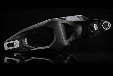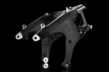 Ducati Front-Frame-Konzept (Aluminium), einstellbarer Öhlins SD20 Lenkungsdämpfer, Aluminium-Zweiarmschwinge, Hollow Symmetrical Layout, einstellbarer Schwingendrehpunkt (4 Positionen) und Umlenkung