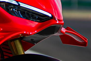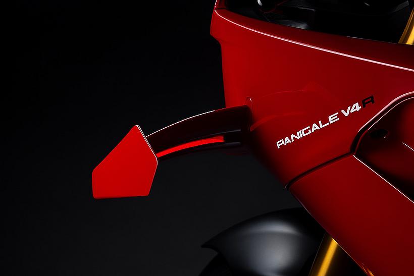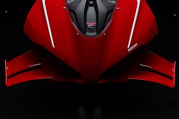 Mit einer vom Wind geformten Silhouette ist die Panigale V4 R pure Aerodynamik. Die Panigale V4 R wurde strömungstechnisch komplett überarbeitet, um den Luftwiderstand zu reduzieren und gleichzeitig den Abtrieb zu erhöhen. Das Aerodynamikpaket umfasst neu gestaltete Winglets, die noch leistungsstärker sind als jene der Panigale V4 7G und der vorherigen R-Version. Jedes Winglet besteht aus zwei Elementen, die elegant in die Linien der oberen Verkleidung integriert sind, und zeichnet sich durch eine 20 mm größere Spannweite sowie eine neu geformte, markante Außenkante aus. Das Ergebnis: 25 % mehr Abtrieb bei gleichbleibendem Luftwiderstand – konkret entspricht das +4,8 kg bei 270 km/h und +6 kg bei 300 km/h. Um maximale Performance auf der Rennstrecke zu erzielen, ist die Panigale V4 R 7G mit einem dynamischen Frontlufteinlass ausgestattet, der in Zusammenarbeit mit Ducati Corse entwickelt wurde und das Ansaugluftvolumen erhöht. Im Vergleich zur Panigale V4 wurde die Unterkante des Einlasses um 70 mm nach vorne verlängert, wodurch sich der Luftdruck am Filter bei 300 km/h um 0,6 % steigert. Das Ergebnis: eine höhere Luftdichte und ein Leistungszuwachs von 1,3 PS bei dieser Geschwindigkeit. Der vordere Bereich des Lufteinlasses besteht aus einem speziellen Material, das sich bei Kontakt mit dem vorderen Kotflügel während einer harten Bremsung verformen kann. Die Panigale V4 R bietet dem Fahrer ein Maß an aerodynamischem Schutz, das ihn in eine Art „Luftblase“ aus stabiler Strömung eintauchen lässt – ähnlich wie auf der Desmosedici GP. So kann er auf der Geraden höhere Geschwindigkeiten erreichen und sich zwischen den Bremszonen spürbar entspannen. Die Verkleidung, die mit der Panigale V4 7G eingeführt wurde, weist einen um 4 % reduzierten Luftwiderstand auf und sorgt gleichzeitig für einen um 9 % bzw. 19 % höheren Luftstrom zu Wasser- und Ölkühler. Der erhöhte Durchfluss trägt dazu bei, die Motortemperaturen während des Einsatzes auf der Rennstrecke zu senken. Dieses Ziel wurde auch durch die Einführung eines Deflektors erreicht, der den Luftstrom in der Nähe des Ölkühlers begradigt und dessen Effizienz erhöht. Der aerodynamisch geformte vordere Kotflügel trägt ebenfalls zur Verbesserung der Gesamteffizienz bei. Das Design der Panigale V4 7G reduziert die Oberfläche der Verkleidung in der Seitenansicht und nähert sich damit dem aktuellen MotoGP-Layout an, um die Querluftdurchlässigkeit zu erhöhen. Diese Lösung macht das Motorrad bei hohen Geschwindigkeiten wendiger und weniger anfällig für Seitenwind, was durch das Feedback der Fahrer bestätigt wurde.