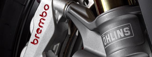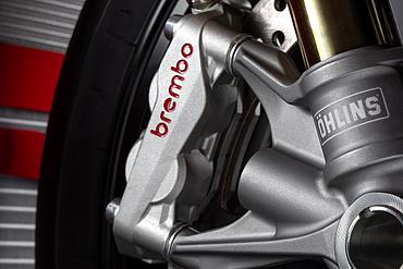Die Panigale V4 R ist das erste Motorrad, das mit dem neuen Öhlins SD20-Lenkungsdämpfer ausgestattet ist. Dieser zeichnet sich durch ein kompakteres Design aus und bietet dank eines größeren Kolbendurchmessers einen erweiterten Einstellbereich, kürzere Reaktionszeiten und eine höhere Dämpfungskraft. Selbst wenn das Vorderrad aufgrund der brachialen Leistung zeitweise den Bodenkontakt verliert, verhindert der Lenkungsdämpfer Unruhe im Fahrwerk.
