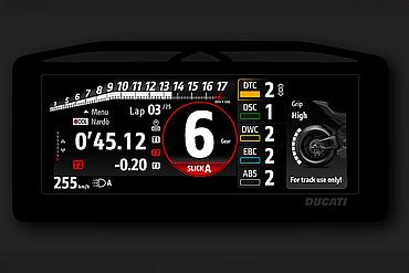 Im Anzeigemodus Track fühlt man sich, als säße man auf einer Desmosedici GP. In diesem Modus ist der Drehzahlmesser – dessen Skala bis 9.000 U/min komprimiert ist – fast der gesamte Bildschirm gewidmet. Der Fokus liegt auf den für den Rennstreckeneinsatz relevanten Informationen: In der Mitte wird der eingelegte Gang angezeigt, auf der rechten Seite erscheinen die Anzeigen für die aktuell aktiven Assistenzsysteme, während auf der linken Seite Informationen zu den Rundenzeiten sowie der Zugang zum Menü angezeigt werden. Im Info-Modus Track werden die Widgets auf der rechten Seite eingeblendet.