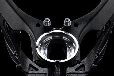 Die Gabelbrücken sind elementare Bestandteile eines jeden Fahrwerkkonzepts. Bei Panigale und Streetfighter V4 sorgen geschmiedete Gabelbrücken für eine perfekte Verbindung von Gabel und Lenkkopf. Gleichzeitig erlaubt die Dreifach-Klemmung, mit reduzierten Anzugsmomenten der Klemmschrauben zu arbeiten und so die Gabel nicht zu stark unter Druck zu setzen. Die Gabelbrücke der Panigale V4 R hat jedoch nicht nur die Aufgabe, der Gabel festen Halt zu geben – sie trägt auch die laufende Nummer des jeweiligen Motorrads, die mit der Fahrgestellnummer übereinstimmt. Ein Detail, das ihre Exklusivität eindrucksvoll unterstreicht.