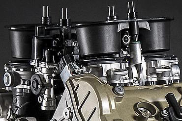 Benzineinspritzung, ovale 56 mm Drosselklappenkörper (äquivalent), zwei Einspritzdüsen pro Zylinder, Full-Ride-By-Wire Technologie, variable Ansaugtrichterlänge