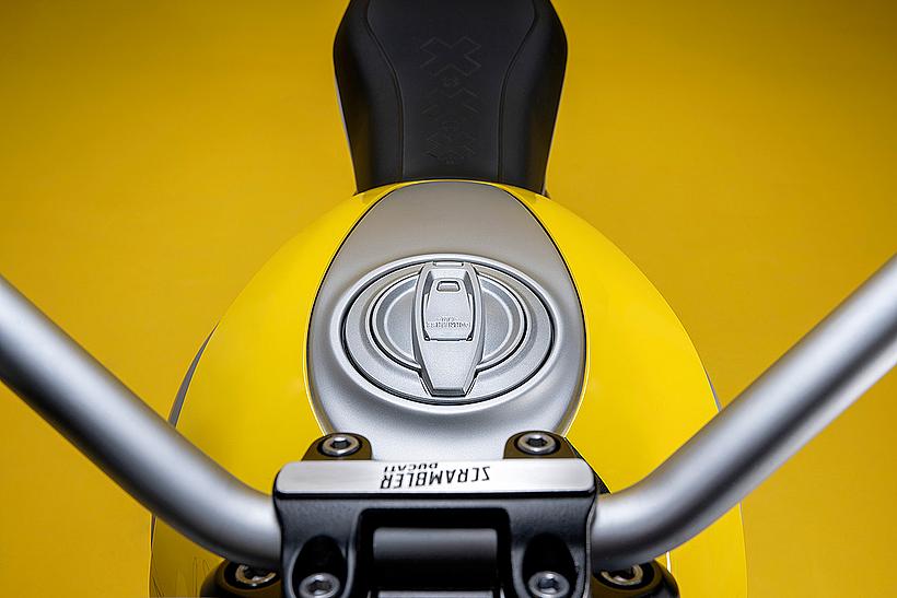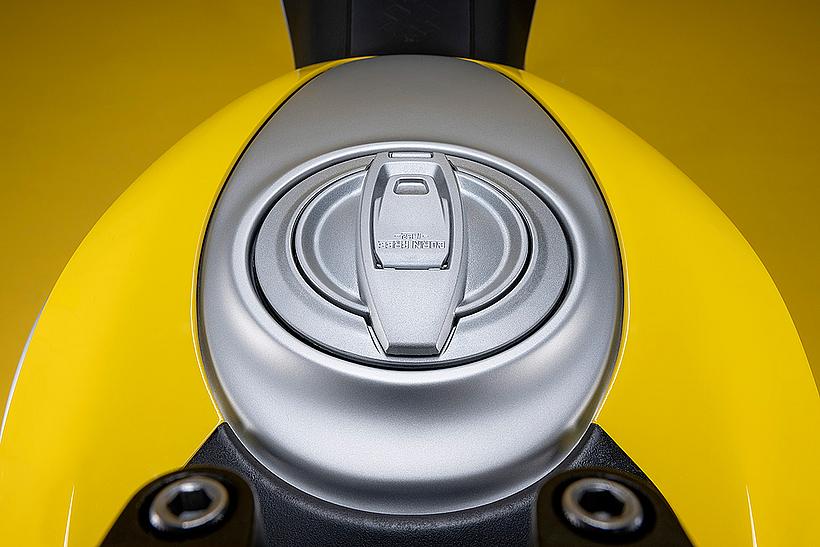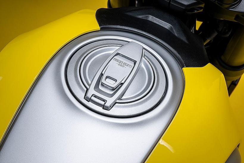 Die edlen Tankblenden passen perfekt zur traditionellen Tropfenform des 14,5-Liter-Tanks. Ein weiteres schönes Detail ist die Aufschrift „born free – 1962“, die auf dem Tankdeckel eingearbeitet ist und an die erste Ducati Scrambler erinnert, die 1962 in Borgo Panigale vom Band lief.