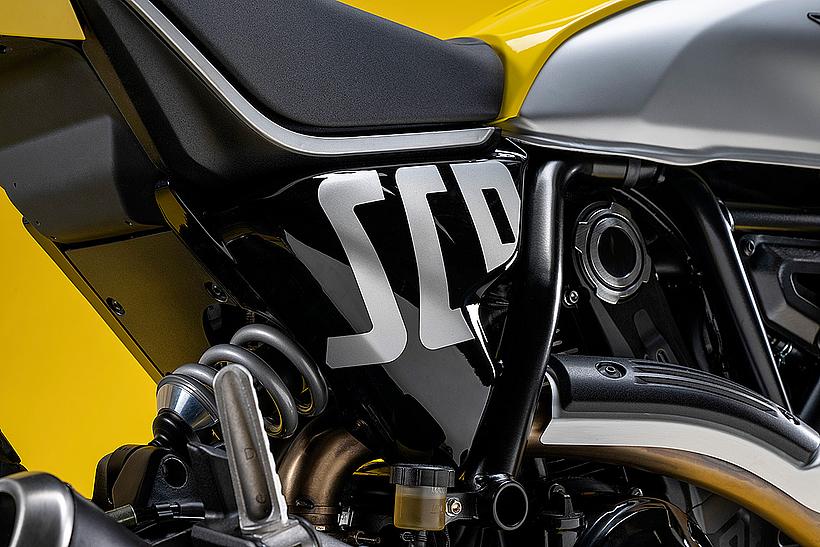 Der Stahltank wurde neu gestaltet und mit austauschbaren Tankverkleidungen versehen, die gemeinsam mit Heck, Kotflügel und Scheinwerferdeckeln dem Motorrad seine Farbe geben. Das…