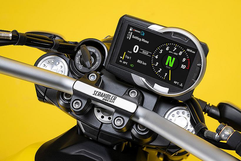Das 4,3-Zoll-TFT-Farbdisplay ist modern und klassisch zugleich. Rechts werden der große Drehzahlmesser, der aktuell gewählte Gang und der aktivierte Riding Mode angezeigt. Links finden sich die Lufttemperatur, der Kraftstoffstand und die Informationen aus dem Ducati Multimedia System (DMS), welches es ermöglicht, das Smartphone über ein Bluetooth-Modul (als Zubehör erhältlich) mit dem Motorrad zu verbinden und bestimmte Funktionen über die am Lenker angebrachten Tasten zu steuern. In der DMS-Funktion werden die Bedienelemente des Musik-Players, der Verbindungsstatus des Headsets, eingehende Anrufe sowie Hinweis-Symbole für empfangene Nachrichten angezeigt.