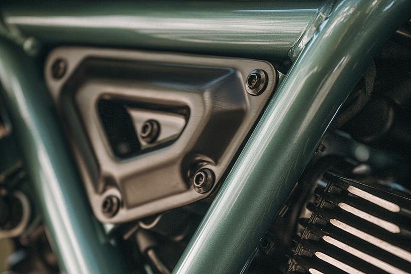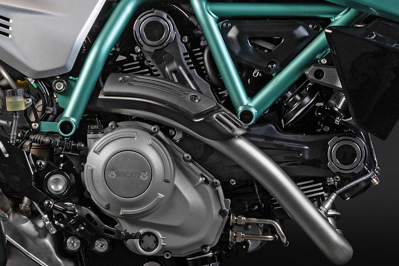 Der Motor, ein zentraler Bestandteil der Persönlichkeit der Ducati Scrambler Formula 73, hat ebenfalls ein optisches Update erhalten: Er ist schwarz lackiert und präsentiert sich mit gefrästen und polierten Kühlrippen. Die Kupplungs- und Lichtmaschinenabdeckungen der Formula 73 sind in Silber gehalten und tragen das historische Ducati-Logo aus den 70er Jahren, was dem Motorrad einen klassischen, unverwechselbaren Look verleiht.