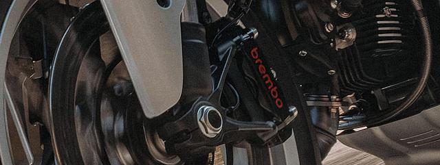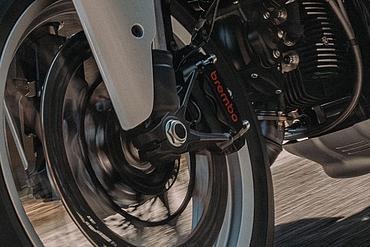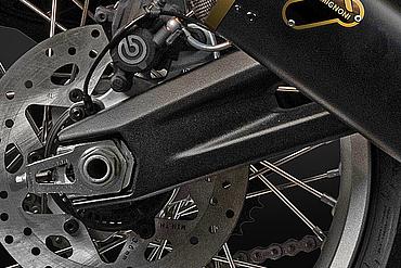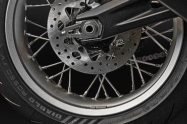 Die mächtige 330-mm-Bremsscheibe mit der 4-Kolben-Monobloc-Bremszange von Brembo sorgt für hervorragende Bremsleistung und exzellente Dosierbarkeit. Das serienmäßige Kurven-ABS, entwickelt in Zusammenarbeit mit Bosch, bietet maximale Sicherheit – selbst bei Regen und auf losem Untergrund.