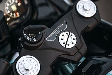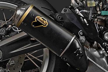 Der in Zusammenarbeit mit Termignoni entwickelte Schalldämpfer, der speziell für dieses Modell mit ästhetischen Details entworfen wurde, verleiht dem Motorrad einen vollen und kraftvollen Klang. Die Ride-by-Wire-Drosselklappe sorgt für ein schnelles, progressives und gleichmäßiges Ansprechverhalten des Motors, selbst bei niedrigen Drehzahlen. Das Logo und der Ring sind in edlem Gold gehalten, die Abdeckkappe besteht aus hochwertigem Carbon.