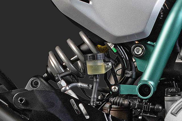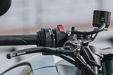 Die zahlreichen Aluminium-Komponenten, wie die Brems- und Kupplungshebel mit den Ausgleichsbehältern, die Aluminium-Fußrasten und der serienmäßige Rizoma-Tankdeckel, fallen sofort ins Auge und unterstreichen das Design eines Motorrads, das rund um die Uhr die Blicke auf sich zieht.