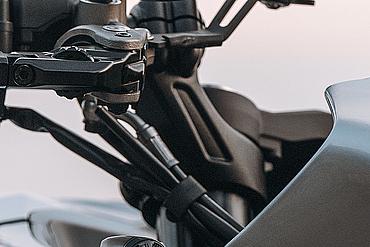Die zahlreichen Aluminium-Komponenten, wie die Brems- und Kupplungshebel mit den Ausgleichsbehältern, die Aluminium-Fußrasten und der serienmäßige Rizoma-Tankdeckel, fallen sofort…
