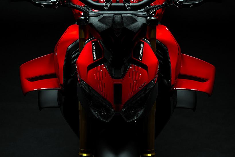 Schließlich dürfen die nach vorne geneigten „Biplane-Wings“, ein Markenzeichen der Streetfighter V4, nicht fehlen. Im Vergleich zum Vorgängermodell sind sie nun noch effektiver, sorgen für 17 kg mehr Abtrieb bei 270 km/h und fügen sich noch raffinierter und eleganter in die Linienführung ein. Die Flügel verleihen dem Streetfighter V4 eine außergewöhnliche Wendigkeit, während sie gleichzeitig bei hohen Geschwindigkeiten für Stabilität und Präzision sorgen und ein herausragendes Gefühl für das Vorderrad vermitteln.