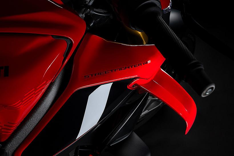 Die unverwechselbare Streetfighter-DNA zeigt sich im Design, auch wenn sich darunter die Panigale verbirgt. Die ausgewogenen Proportionen, die nach vorne gerichteten Linien und der Full-LED-Scheinwerfer mit seinem aggressiven Gesichtsausdruck lassen den Eindruck entstehen, dass sich dieses Motorrad förmlich in die nächste Kurve stürzen möchte. Der besonders schmale 16-Liter-Tank betont das hochgezogene, nach hinten verlagerte Heck mit dem kürzeren Kennzeichenhalter und der etwas tiefer positionierten Soziussitzbank.