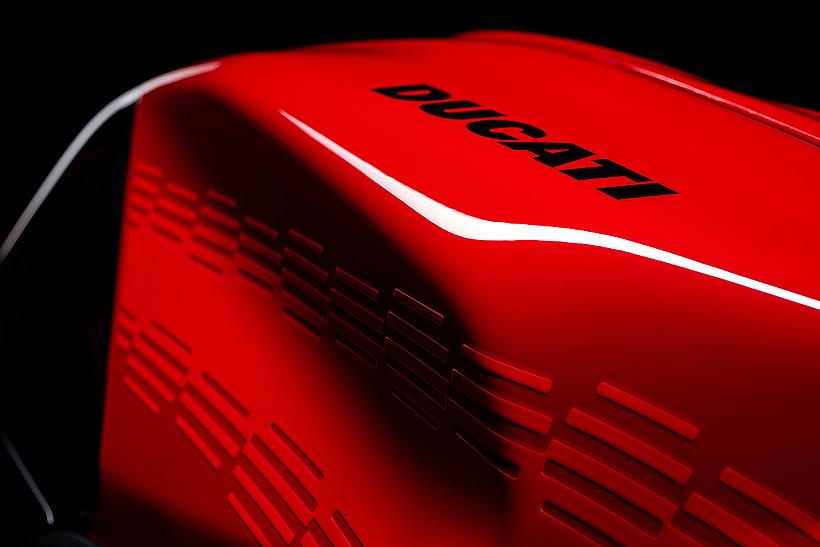 Die enge Zusammenarbeit mit Ducati Corse hat zu einem Motor geführt, der kompakt, leicht und zugleich äußerst leistungsstark ist. In der 90-Grad-V-Bauweise gleichen sich die Massenkräfte erster Ordnung konstruktionsbedingt aus, sodass auf eine Ausgleichswelle zur Reduzierung von Vibrationen verzichtet werden kann. Das spart nicht nur Gewicht, sondern verbessert auch die Drehfreudigkeit und Leistungsentfaltung des Motors. Im Vergleich zu einem klassischen Reihenvierzylinder ermöglicht die kompaktere Bauweise der V-Anordnung eine bessere Massenzentralisierung sowie eine geringere Stirnfläche, was die Aerodynamik verbessert. Zusätzlich reduziert die kürzere Kurbelwelle den gyroskopischen Effekt – ein klarer Vorteil für die Fahrdynamik, insbesondere bei schnellen Richtungswechseln. Das Desmosedici-Stradale-Triebwerk ist um 42 Grad nach hinten geneigt – wie bei den MotoGP-Motoren von Ducati. Diese Neigung verbessert die Gewichtsverteilung, schafft Platz für größere Kühler und erlaubt es, den Schwingendrehpunkt so weit wie möglich nach vorn zu verlagern.
