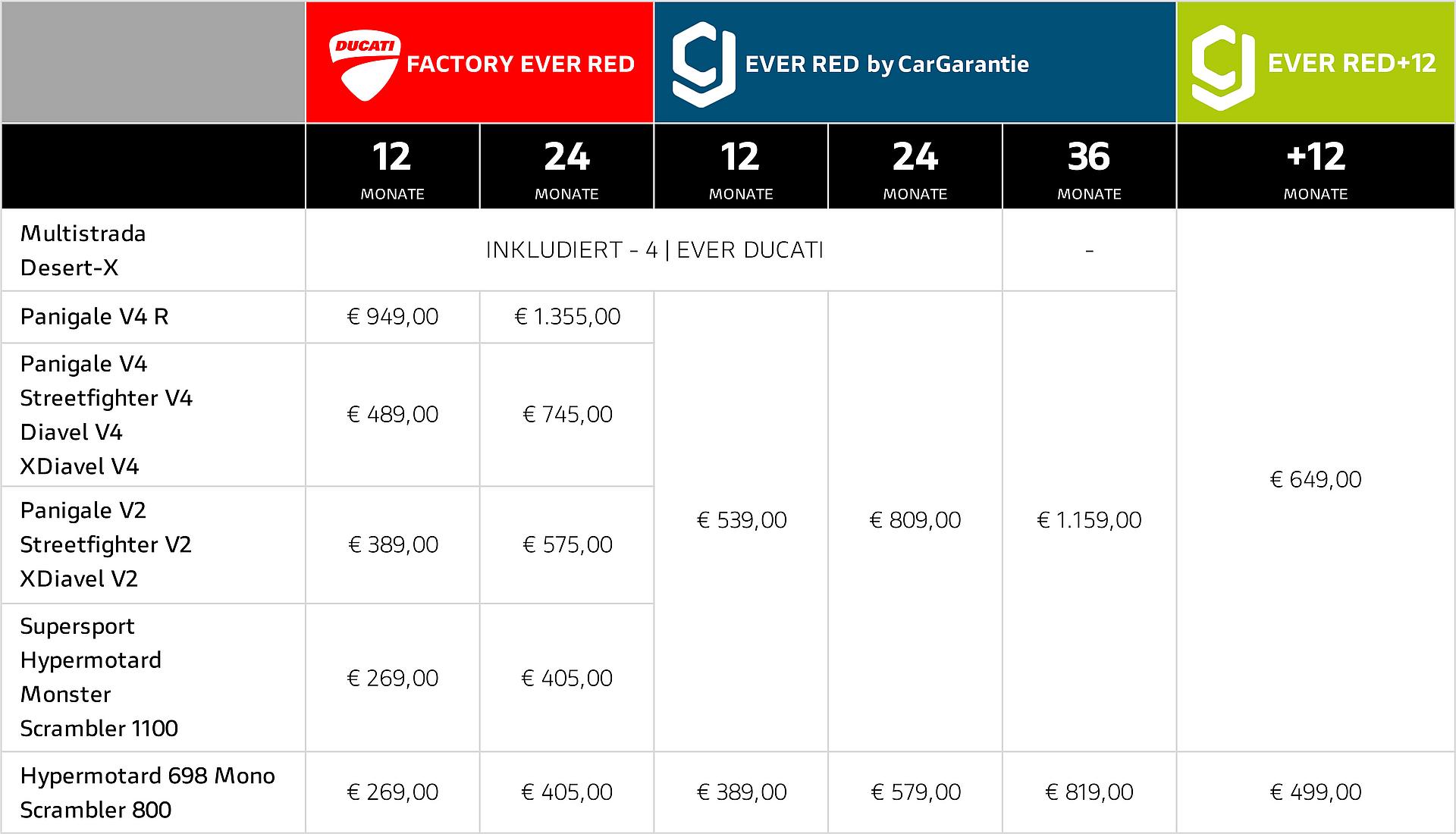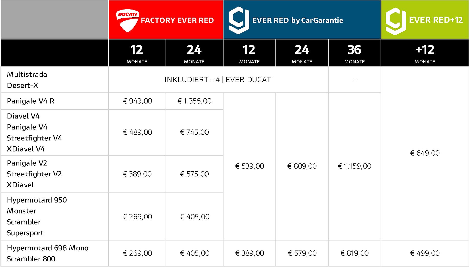 Die Preisempfehlungen für Ever Red variieren je nach Motorradmodell, Deckungsdauer und Produkt. Die Preise für den österreichischen Markt sind nachstehender Tabelle zu entnehmen und verstehen sich einschließlich der gesetzlichen Mehrwertsteuer von 20%.