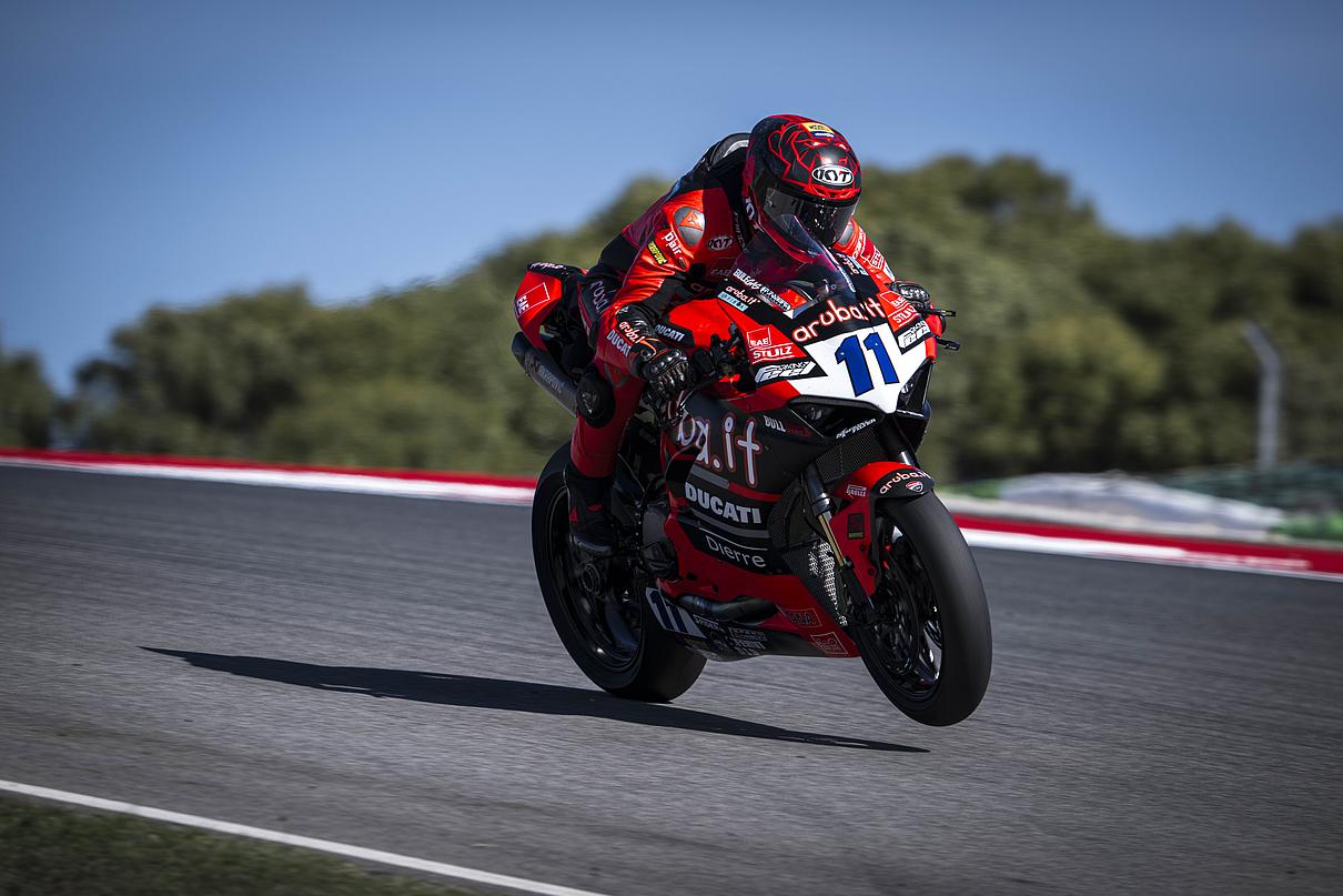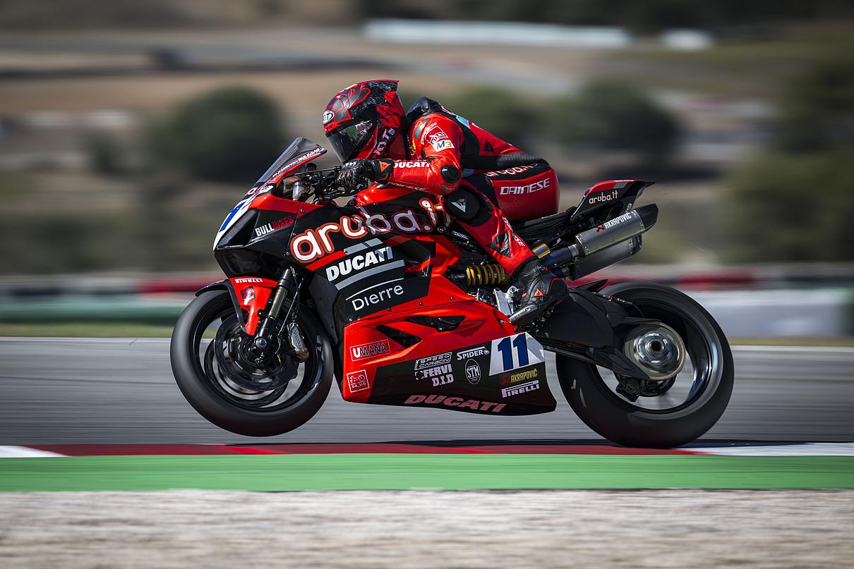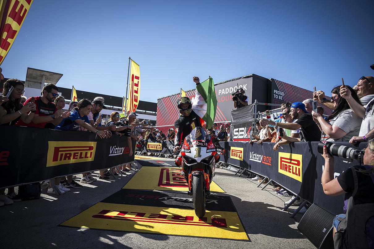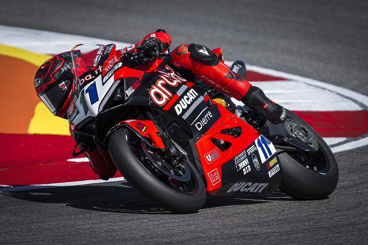 Nicolò Bulega beendet das triumphale Wochenende in Portimao als neuer WorldSSP-Weltmeister mit dem zweiten Platz in Rennen 2 nach einem spannenden Zweikampf mit Manzi (Yamaha) in der letzten Runde. Sein Rückstand auf Manzi Betrug lediglich 0,084 Sekdunden!