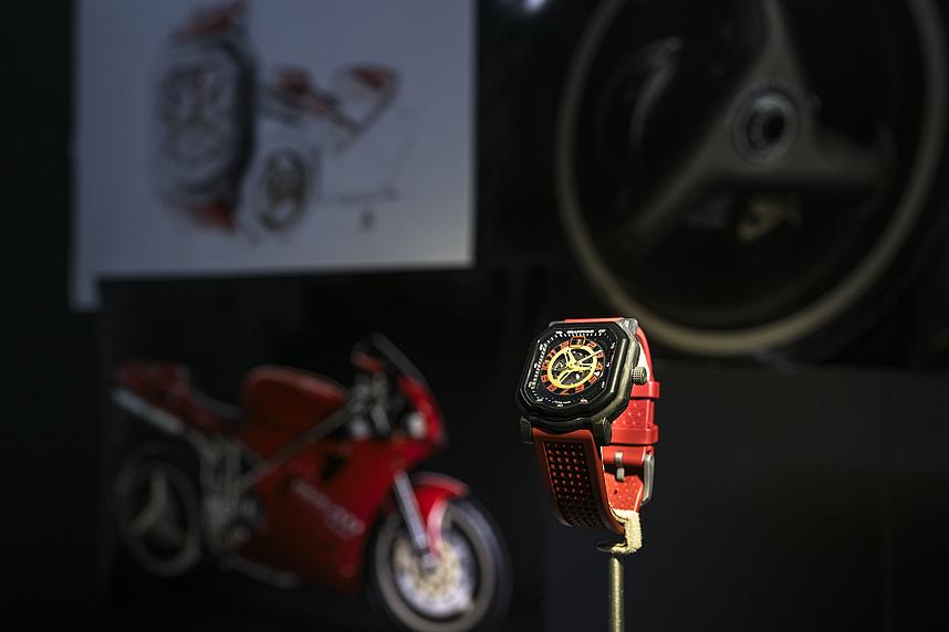 Entwickelt sowohl für Langlebigkeit als auch für Design, verfügt die Uhr über eine mattschwarze Lünette aus Keramik auf einem Gehäuse aus schwarz marmoriertem „Forged-Carbon“, nahtlos integriert mit einer Krone, einem Gehäuseboden und einer Schließe aus Titan – ein Zeugnis für das unermüdliche Streben nach Exzellenz von Ducati und Gerald Charles. Diese Materialien, die in der Motorradwelt als superleicht und widerstandsfähig bekannt sind, waren ideal für diese neue Uhr. Darüber hinaus erinnern die Oberflächenbearbeitungen an den Asphalt auf Rennstrecken. Dank der speziellen Gehäusekonstruktion konnte eine hohe Wasserdichtheit bis 10 ATM/100 m und eine 5G-Schockresistenz erreicht werden.